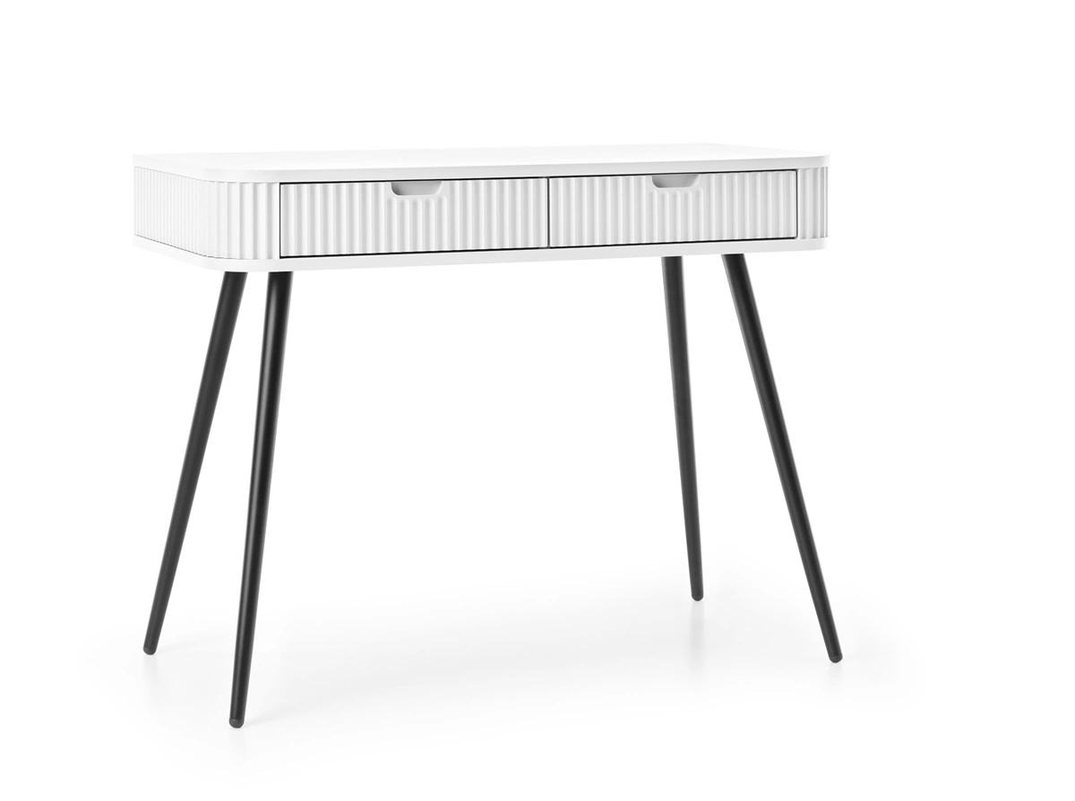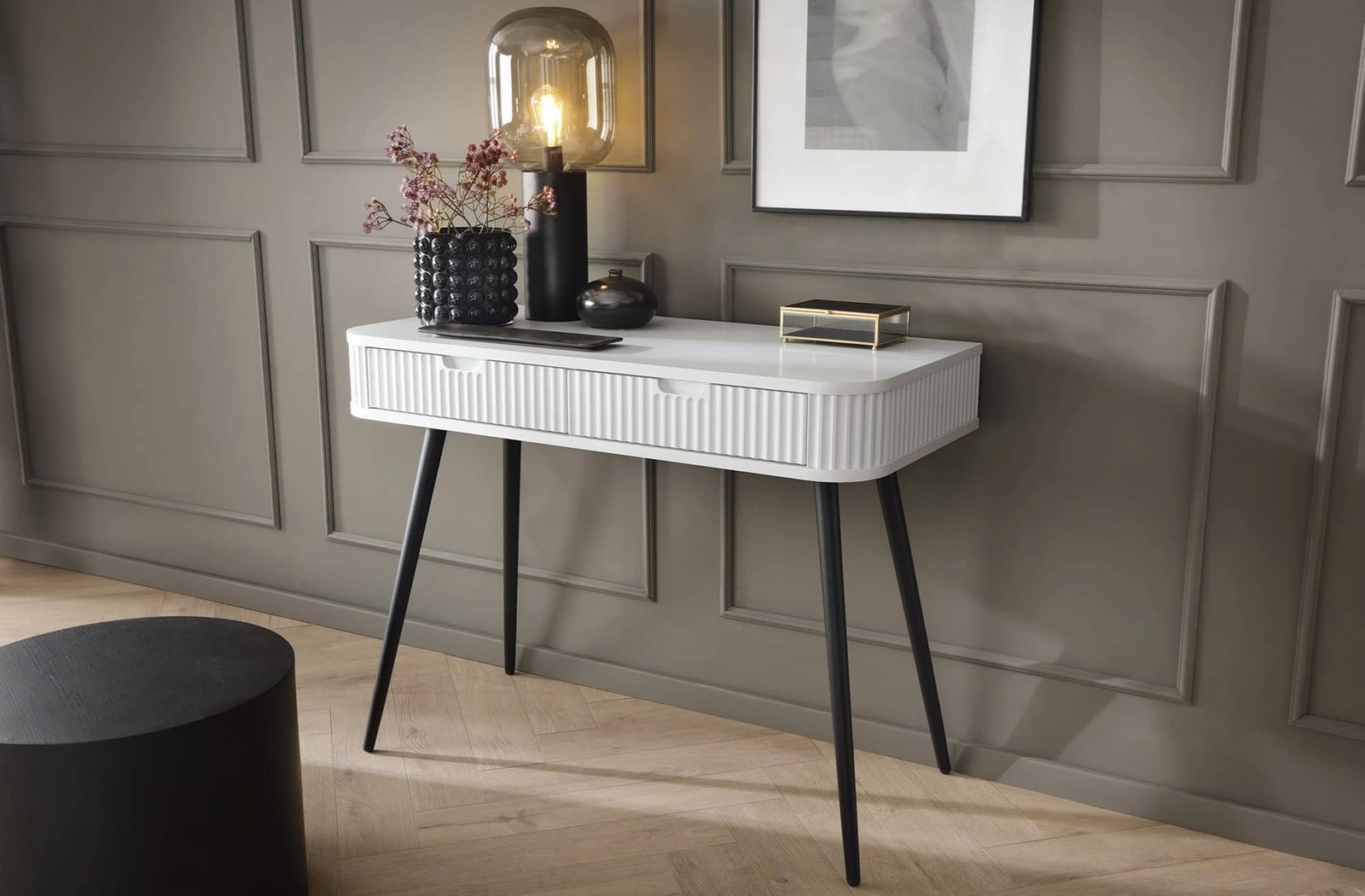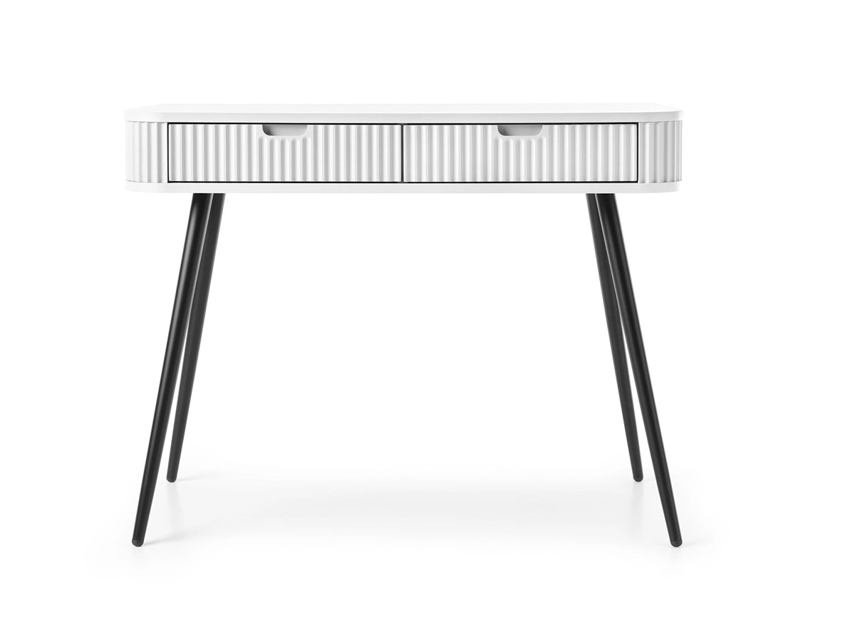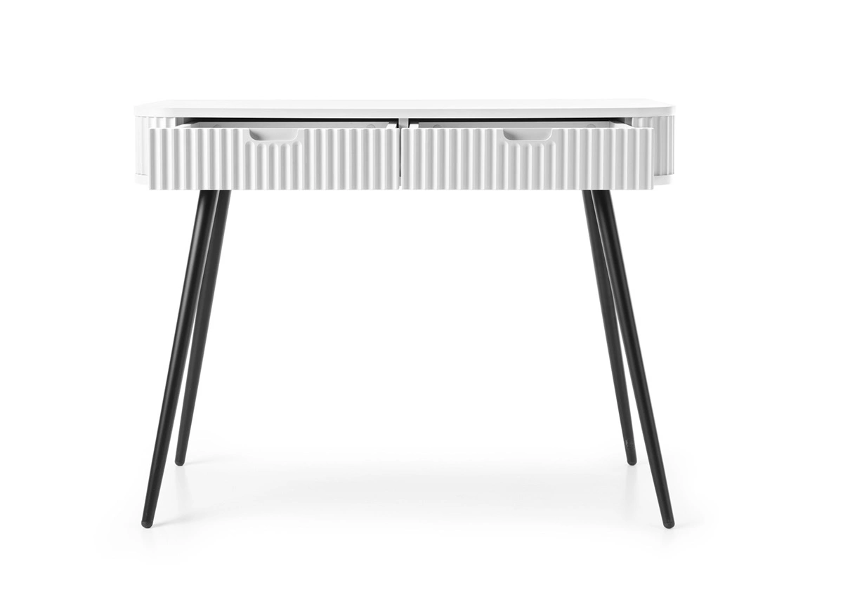 Bílá konzola Zoya se zásuvkami stylový a funkční toaletní stolek zakřivený masivní tvar rýhovaná čela zásuvek kovové nohy