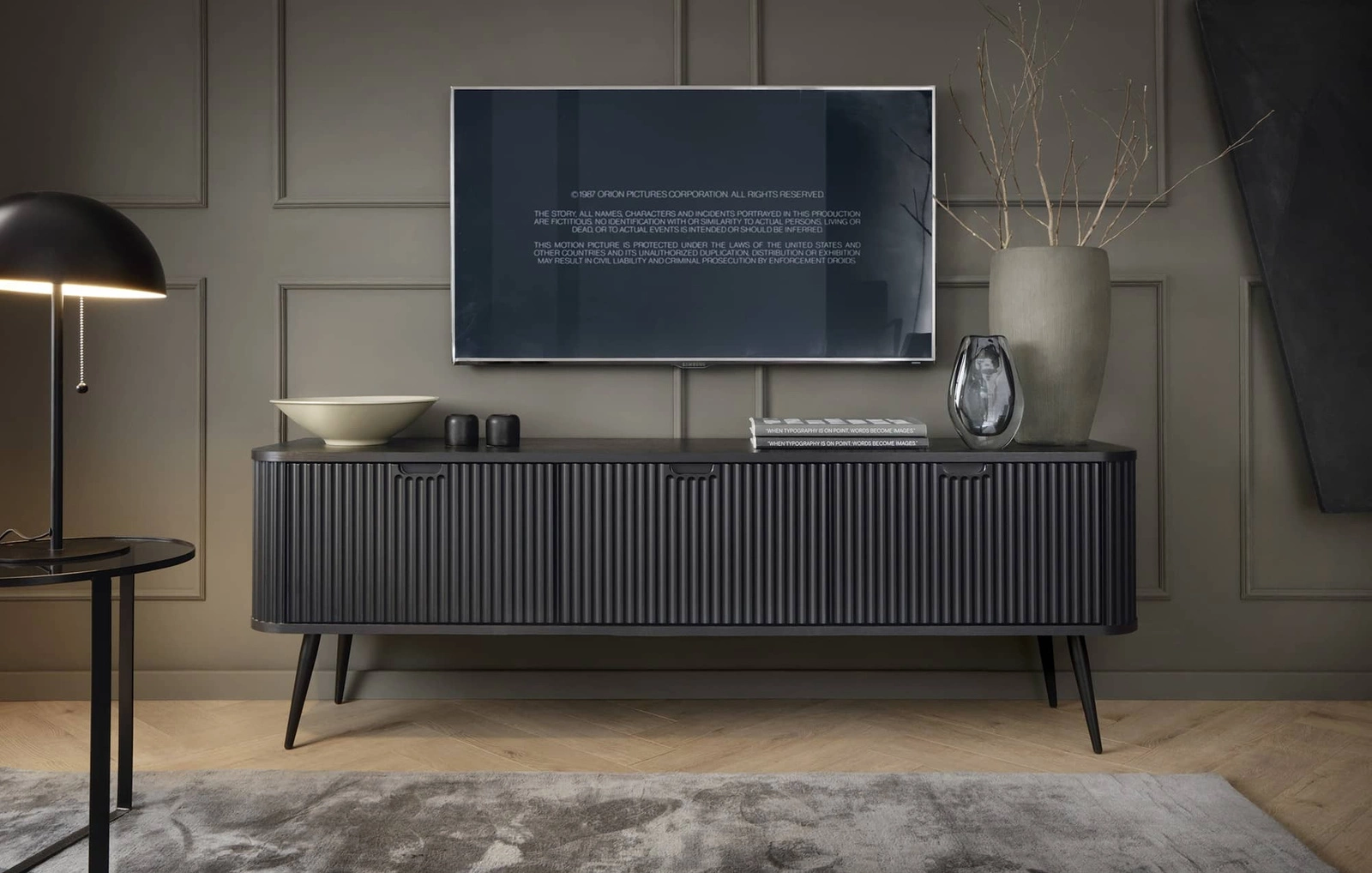 Skříňka RTV Zoya v černé barvě je moderní kus nábytku, který překvapí svým tvarem a estetikou.