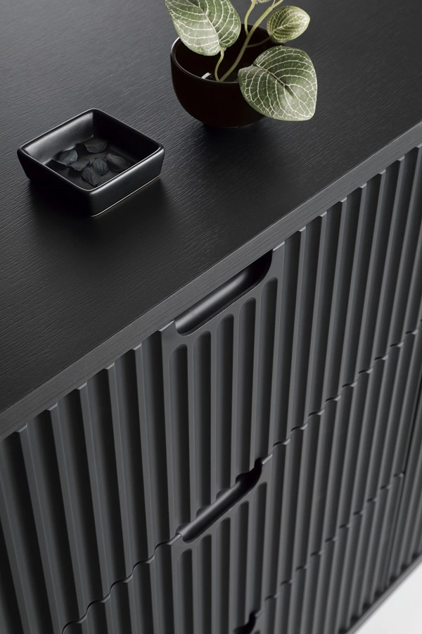 Drážkovaná čela jsou vyrobeny z mDF. Tělo vyrobené z vysoce kvalitní laminovaná deska o tloušťce 18 mm, který je odolný vůči vnějším vlivům, jako jsou otlaky, nárazy a nešťastné škrábance. Kovové nohy v kontrastních černá barva dodávají vizuální lehkost při zachování funkčnosti.