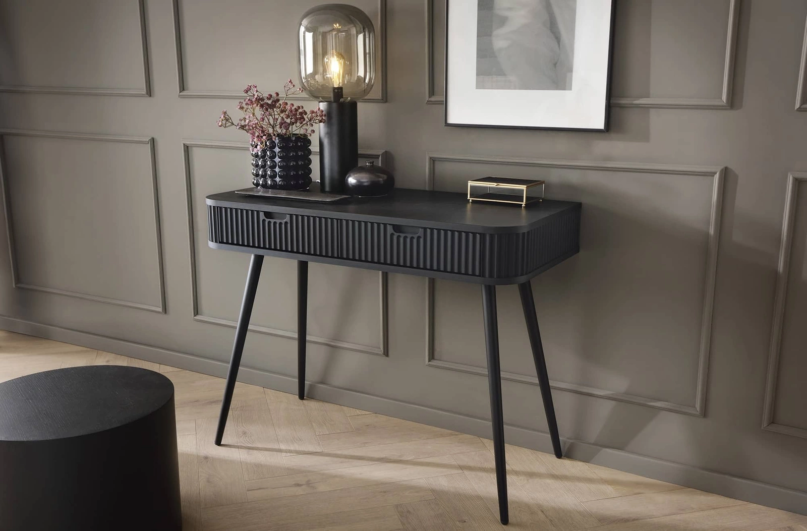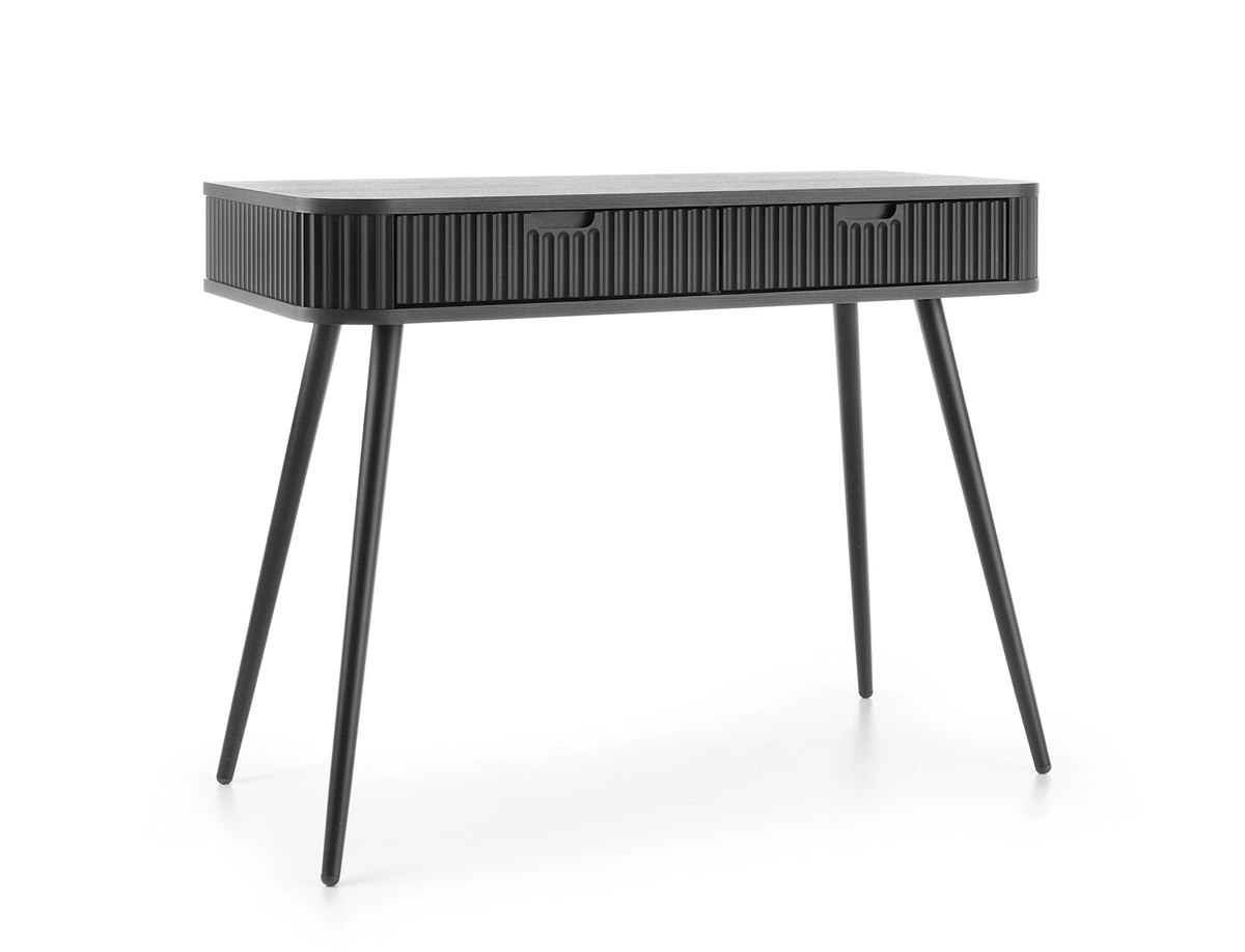 Černá konzola Zoya se zásuvkami stylový a funkční toaletní stolek zakřivený masivní tvar rýhovaná čela zásuvek kovové nohy