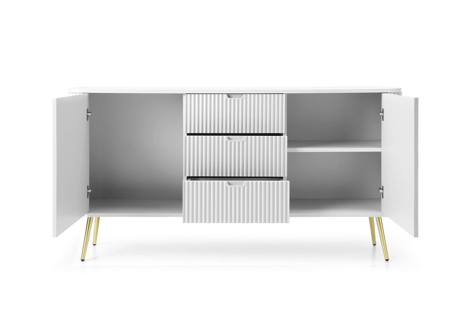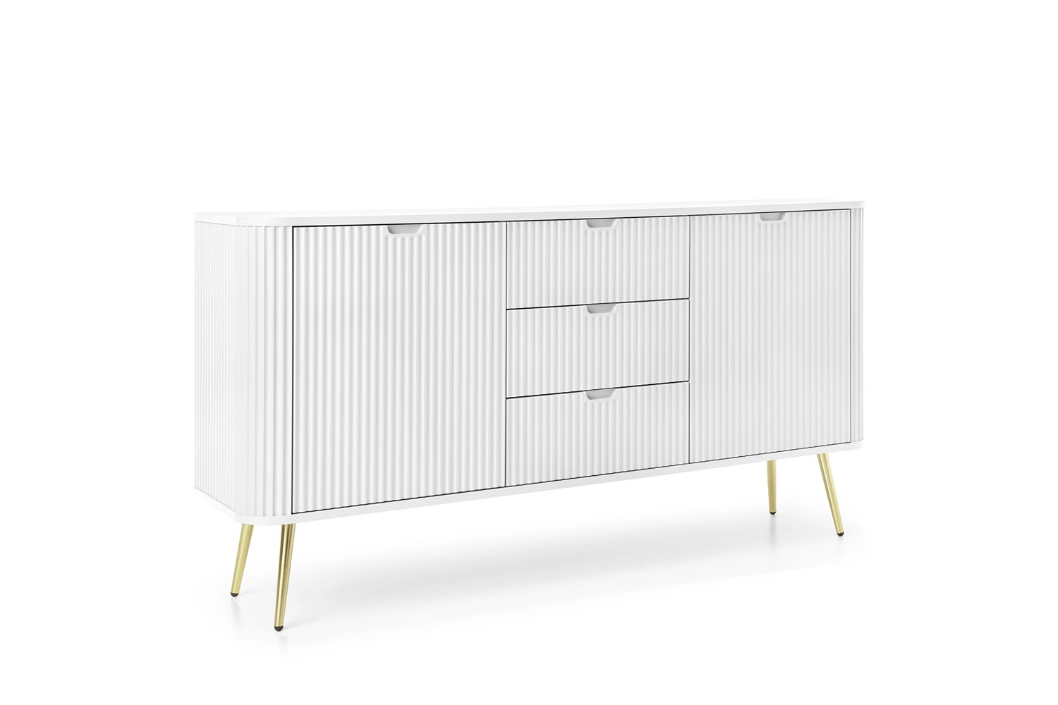 Komoda Zoya 168 cm zásuvková bílá elegantní design oválný tvar na kovových zlatých nohách vkusné rýhované čelo