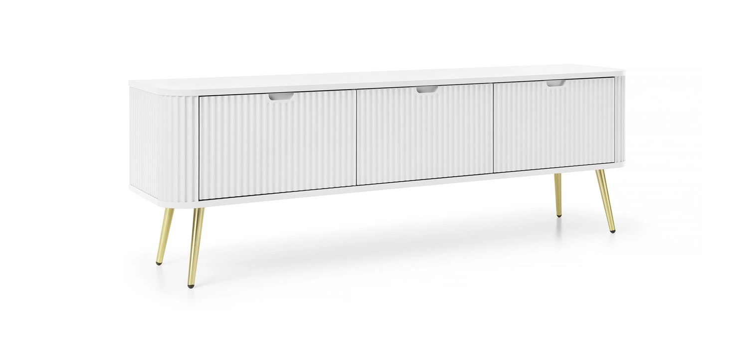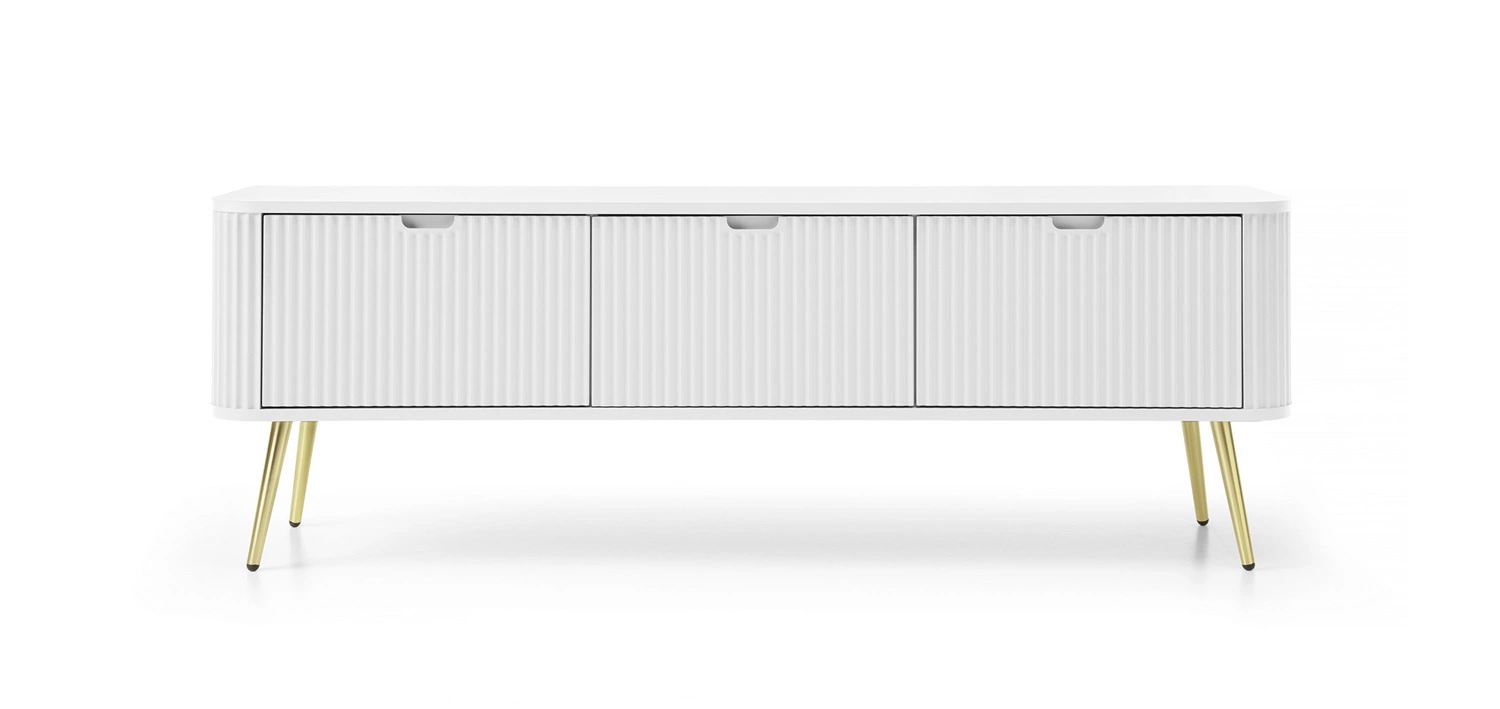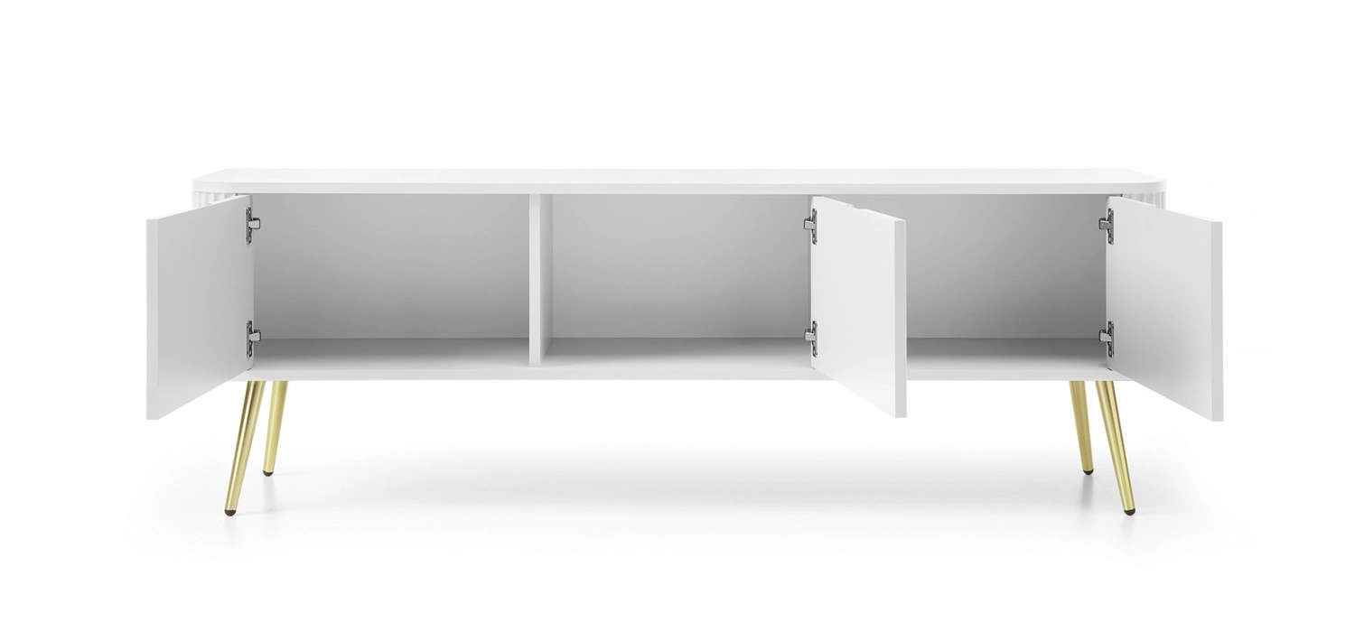 RTV skříňka Zoya 168 cm bílá moderní design masivní sestava na zlatých nohách rýhované čelo charakteristický oválný tvar