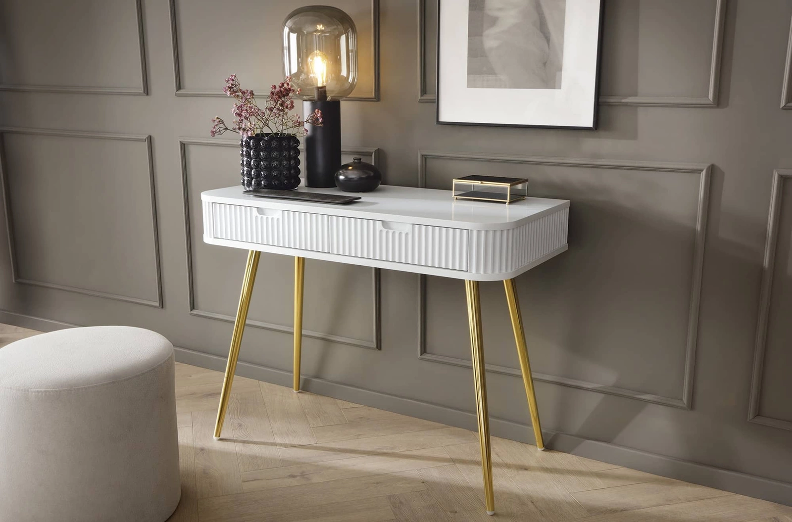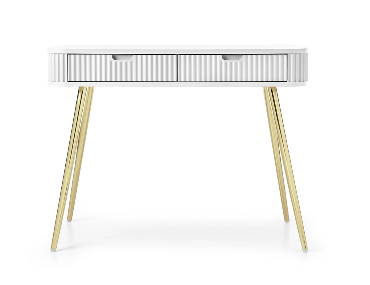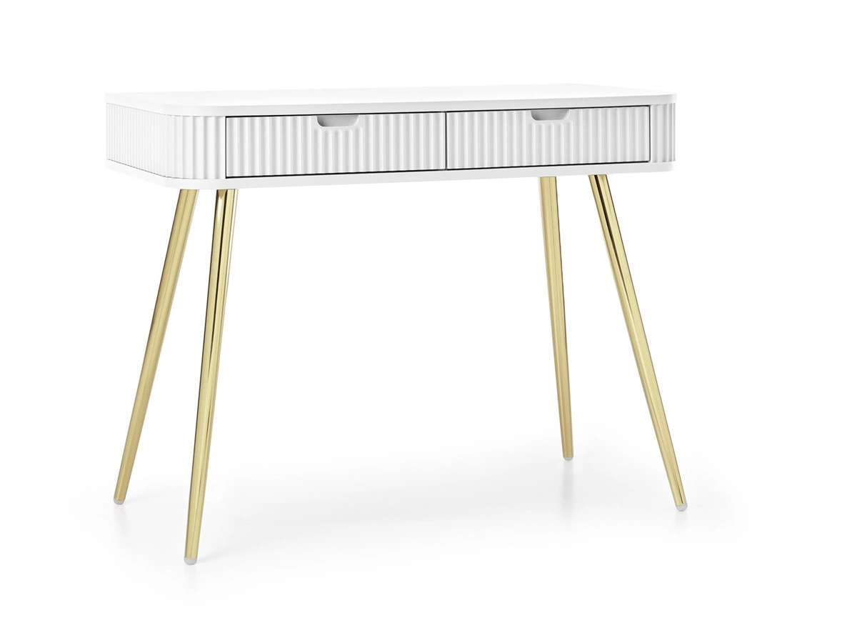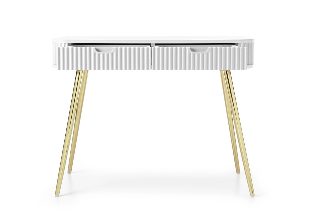 Bílá konzola Zoya se zásuvkami stylový a funkční toaletní stolek zakřivený masivní tvar rýhovaná čela zásuvek zlaté nohy