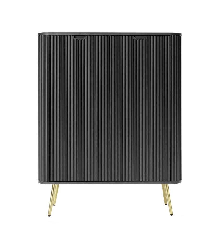 Drážkovaná čela jsou vyrobeny z mDF. Tělo vyrobené z vysoce kvalitní laminovaná deska o tloušťce 18 mm, který je odolný vůči vnějším vlivům, jako jsou otlaky, nárazy a nešťastné škrábance. Kovové nohy v kontrastních zlaté barva dodávají vizuální lehkost při zachování funkčnosti.