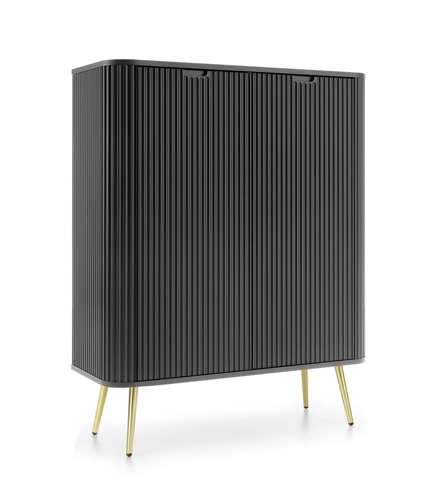 - Vysoká komoda Zoya je velmi elegantní a originální kus nábytku. Oválný tvar, rýhovaná čela a frézované úchyty tvoří neobvyklý povrch masivních dveří. Díky vysokým šikmým nohám zlaté barvy působí komoda velmi elegantně.