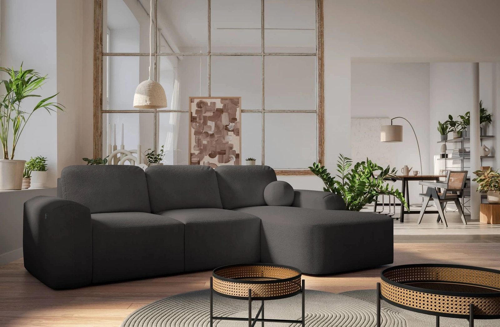 Rohová pohovka Arbon v grafitové barvě je zajímavě vypadající kus nábytku s elegantní povrchovou úpravou.