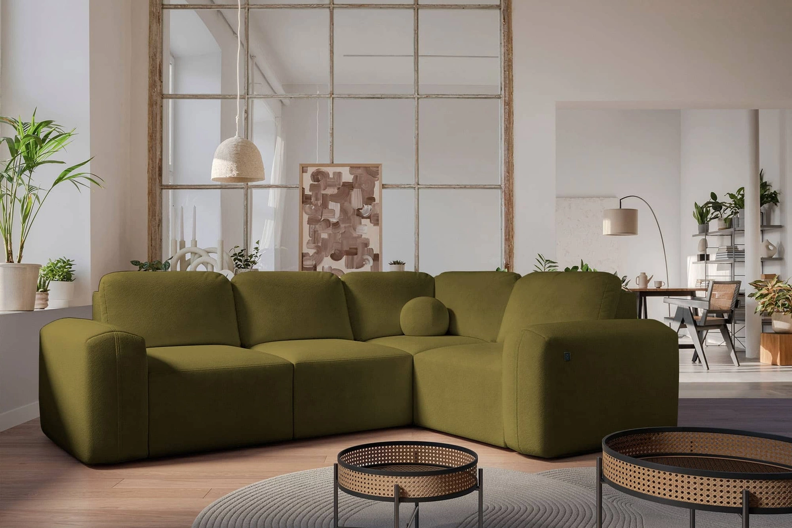 Rohová jednotka Arbon II v olivově zelené barvě je zajímavě vypadající kus nábytku s elegantní povrchovou úpravou.