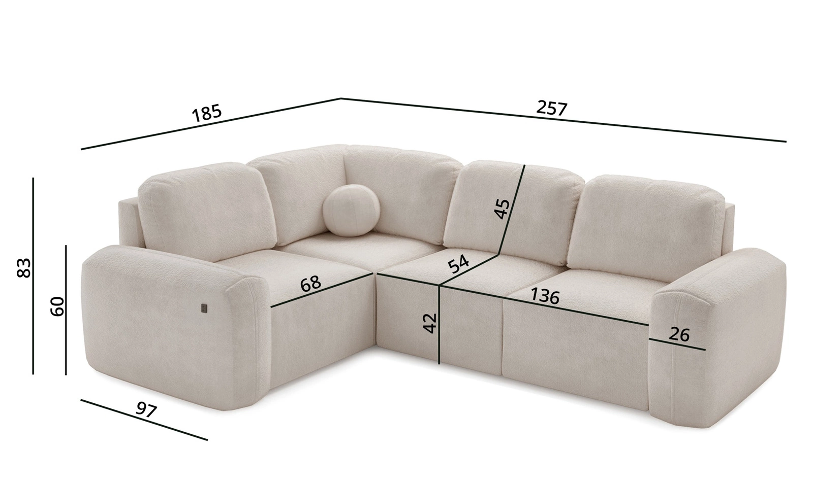 Rozměry nábytku umožňují vyplnění prostoru v prostorném obývacím pokoji nebo zasedací místnosti. Šířka rohu 257 cm, výška 83 cm a hloubka 185 cm. Spací plocha rohové jednotky je 125x205 cm. Výška sedadla nábytku je 42 cm a výška opěradla je 45 cm. Vlnité pružiny a polyuretanová pěna T30 je materiál, z něhož je vyrobeno sedadlo rohu. Soft polštáře opěradla zajišťují vysoký komfort při každodenním odpočinkukterý oceníte vy i vaši hosté při posezení na této jedinečné rohové pohovce.