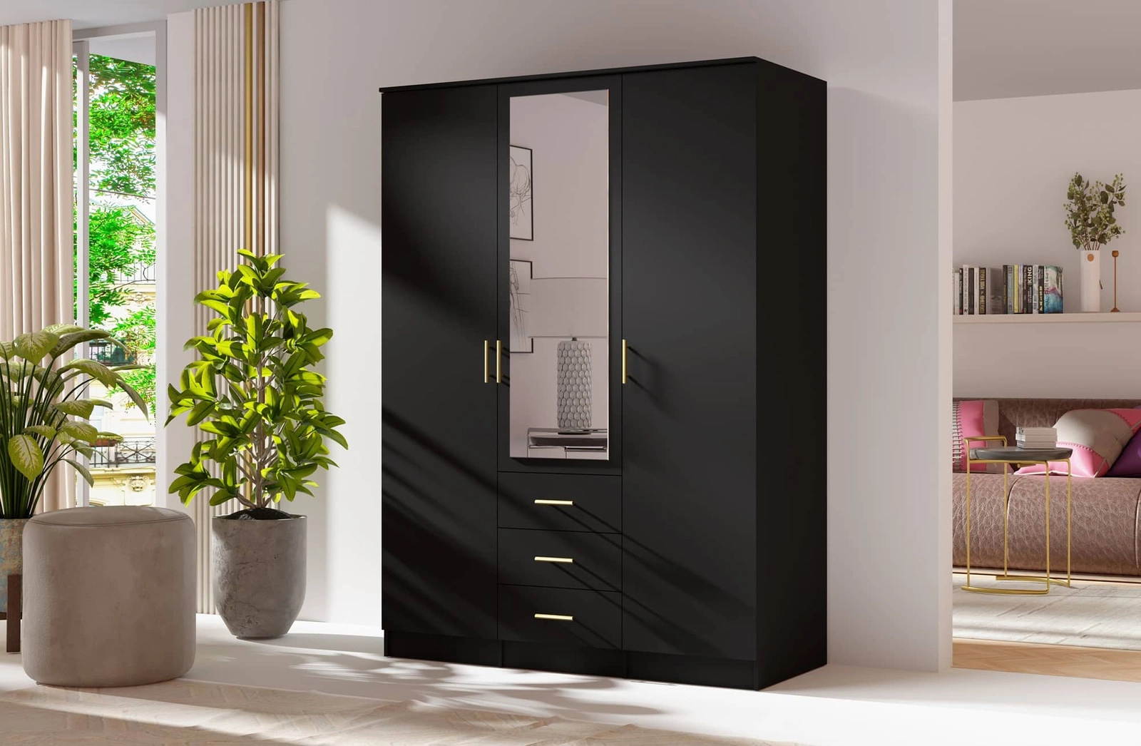 Zrcadlová šatní skříň je vyrobena ze 3 dveře a 3 zásuvky. Kabinet zaručuje pohodlné i bezproblémové požitek a trvanlivost celého nábytku po mnoho let používání. Kombinace klasické černé se zlatými rukojeťmi dělá šatník úspěšným jako šatní skříň do ložnice, jako předsíňová skříň nebo skříň do pokoje dětské. Třídveřové skříně Adel bude také skvělá volba pro pokoj baby. Skvěle se hodí i jako šatní skříň do předsíně.