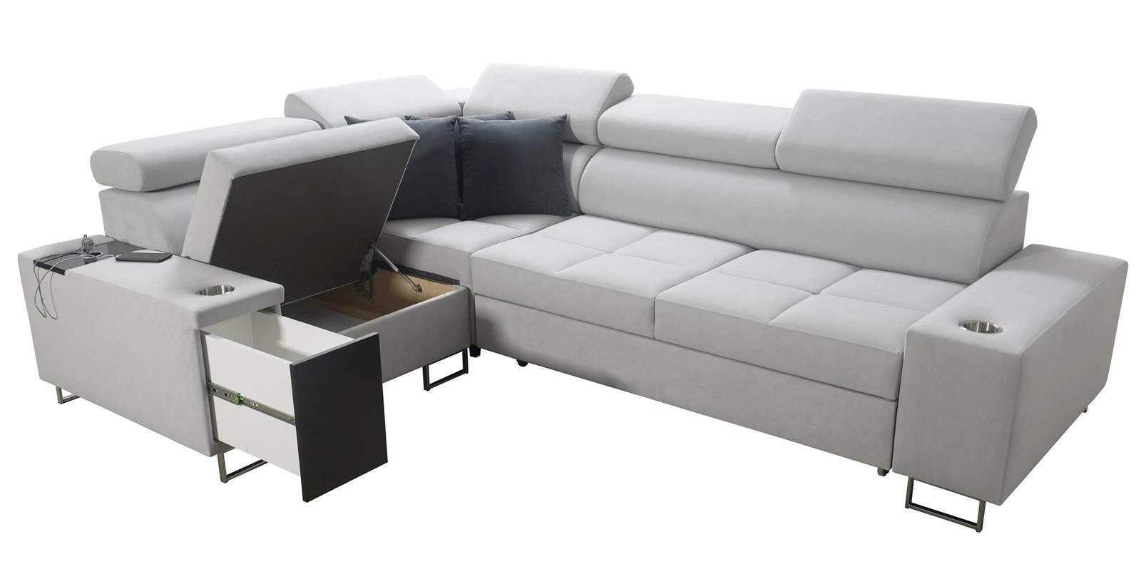 Mezi další funkce tohoto kusu nábytku, které ocení všichni uživatelé, patří kontejner na lůžkoviny, funkce spaní, držáky na nápoje po stranách, nabíjecí zásuvka USB a elektrická zásuvka na boku rohové skříně a zásuvka s plnovýsuvným systémem na boku nábytku.