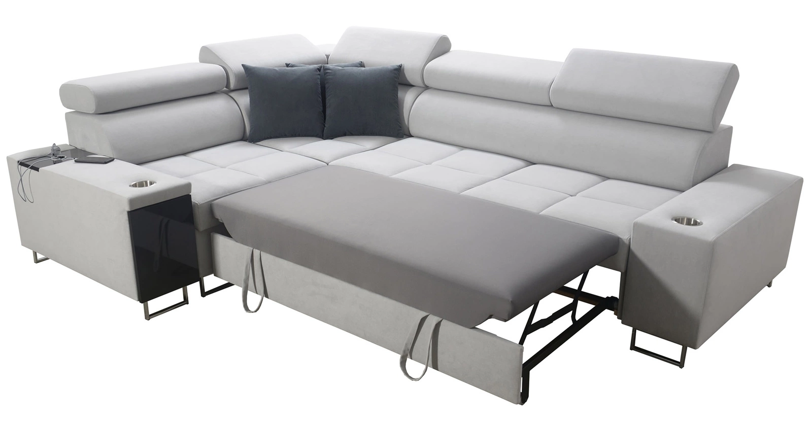 Mezi další funkce tohoto kusu nábytku, které ocení všichni uživatelé, patří kontejner na lůžkoviny, funkce spaní, držáky na nápoje po stranách, nabíjecí zásuvka USB a elektrická zásuvka na boku rohové skříně a zásuvka s plnovýsuvným systémem na boku nábytku.