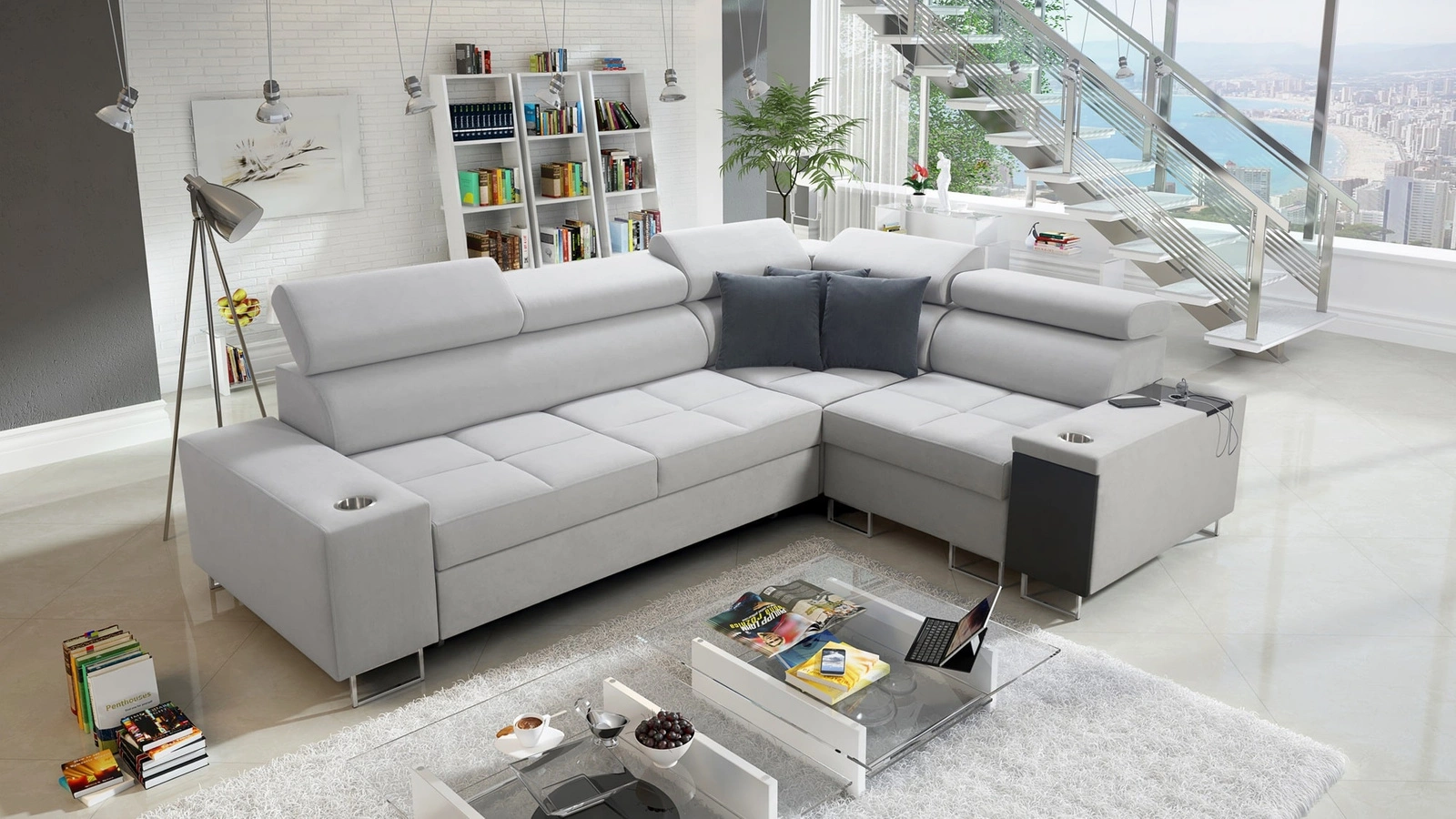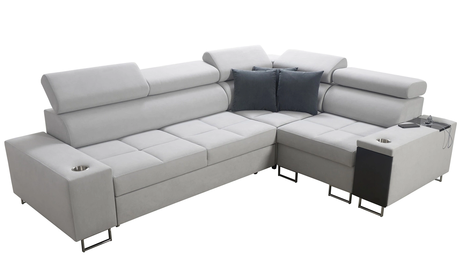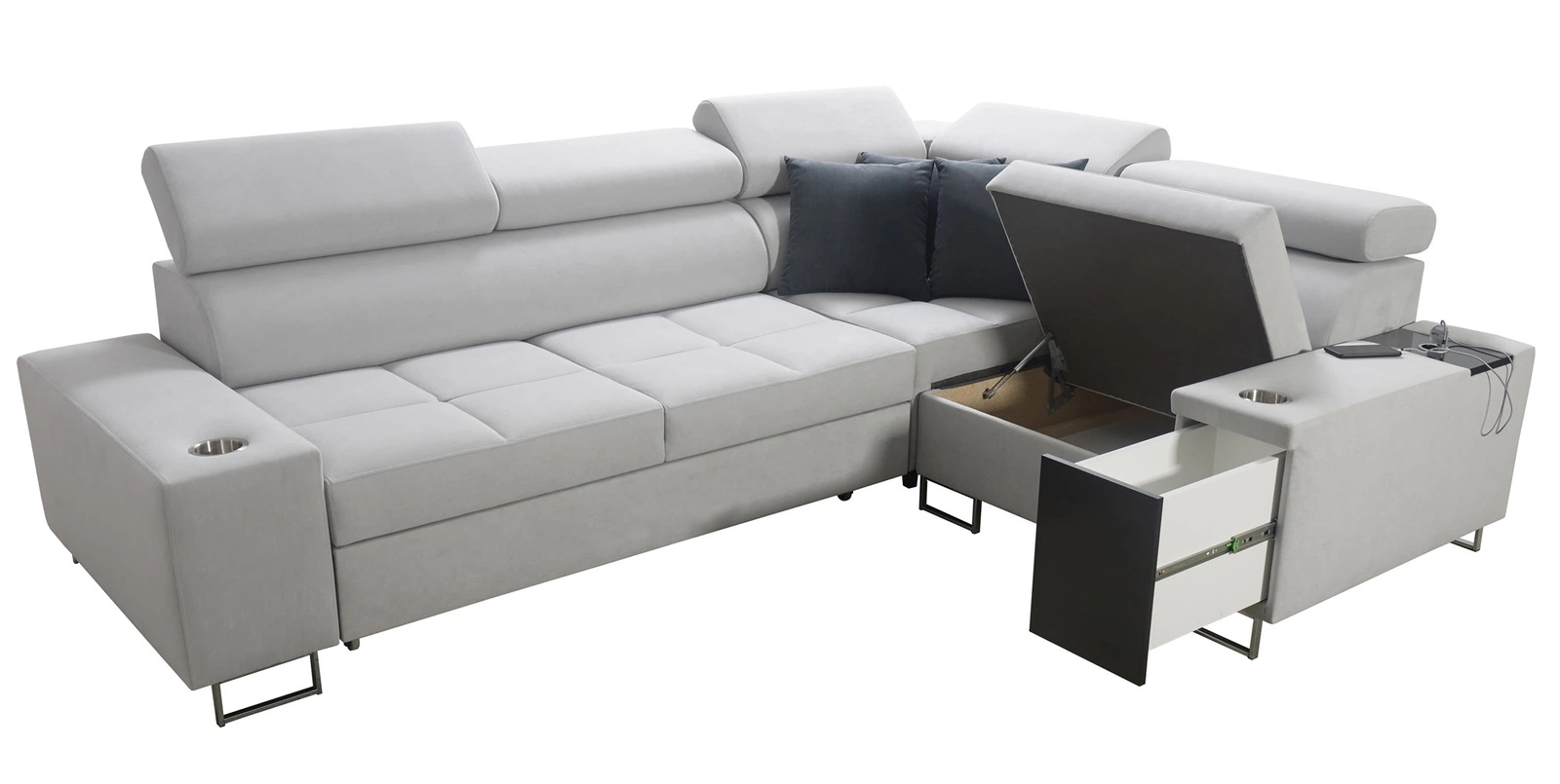 Mezi další funkce tohoto kusu nábytku, které ocení všichni uživatelé, patří kontejner na lůžkoviny, funkce spaní, držáky na nápoje po stranách, nabíjecí zásuvka USB a elektrická zásuvka na boku rohové skříně a zásuvka s plnovýsuvným systémem na boku nábytku.