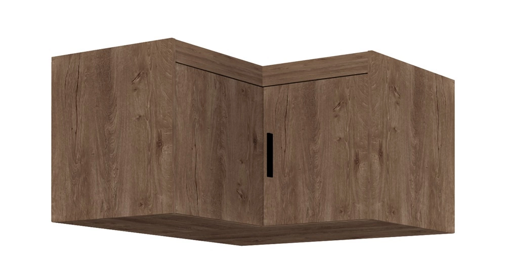 Rohový nástavec na skříň má výklopná dvířka s matným povrchem matný. Nábytek je vyroben z 2 dvířka. Horní část je vyrobena z vysoce kvalitního laminované desky, která se vyznačuje tím, že vysokou odolnost proti vnějším vlivům, jako jsou modřiny, nárazy a nešťastné škrábance. Čela nástavce na šatní skříň doplňují černé úchytky, které podtrhují eleganci nábytku. Rozměry nábytku jsou optimální. Šířka 98x98 cm, výška 55 cm a hloubka 53 cm.