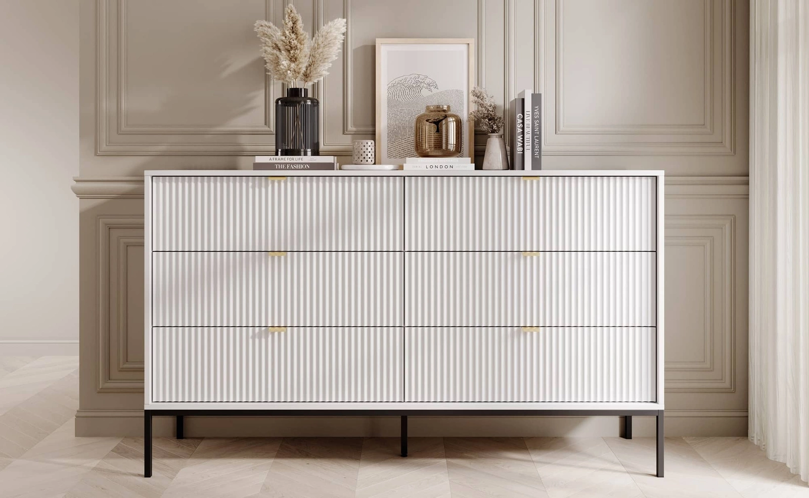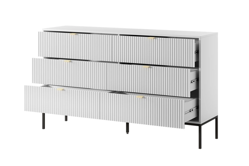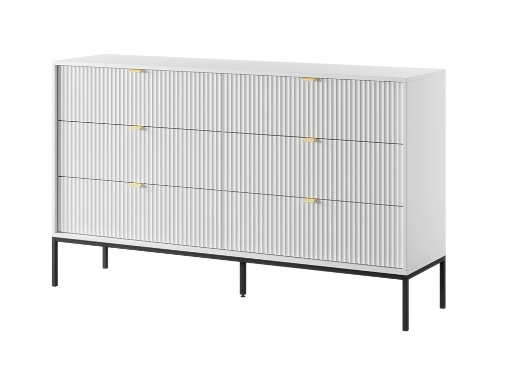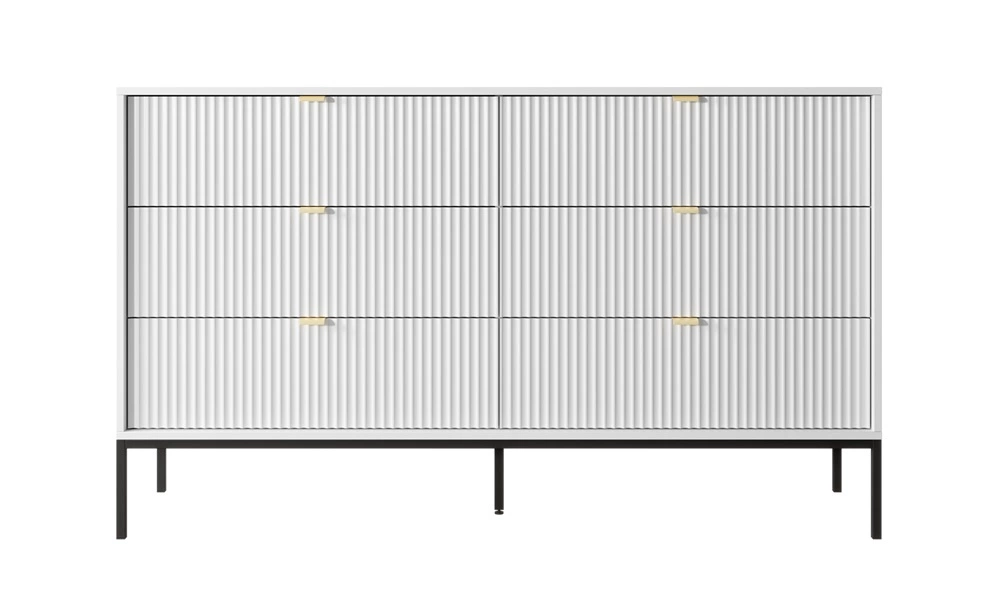 Komoda Lovro 154 cm se zásuvkami bílá moderní design potěší milovníky výrazných interiérů drážkovaná čela kovové úchyty