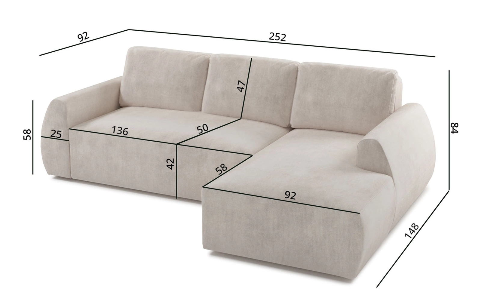 Rozměry nábytku umožňují plánování prostoru v menším obývacím pokoji. Šířka rohu 252 cm, výška 84 cm a hloubka 148 cm. Spací plocha rohové jednotky je 125x202 cm. Výška sedadla nábytku je 42 cm a výška opěradla je 47 cm. Vlnité pružiny a polyuretanová pěna T30 je materiál, z něhož je vyrobeno sedadlo rohu. Soft polštáře opěradla zajišťují vysoký komfort při každodenním odpočinkukterý oceníte vy i vaši hosté při posezení na této jedinečné rohové pohovce.