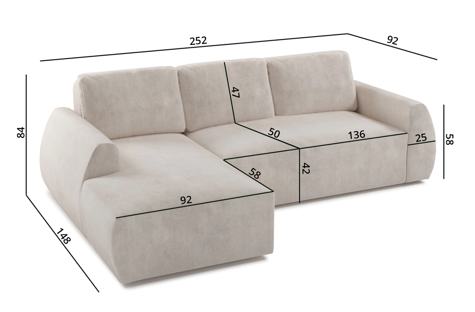 Rozměry nábytku umožňují plánování prostoru v menším obývacím pokoji. Šířka rohu 252 cm, výška 84 cm a hloubka 148 cm. Spací plocha rohové jednotky je 125x202 cm. Výška sedadla nábytku je 42 cm a výška opěradla je 47 cm. Vlnité pružiny a polyuretanová pěna T30 je materiál, z něhož je vyrobeno sedadlo rohu. Soft polštáře opěradla zajišťují vysoký komfort při každodenním odpočinkukterý oceníte vy i vaši hosté při posezení na této jedinečné rohové pohovce.