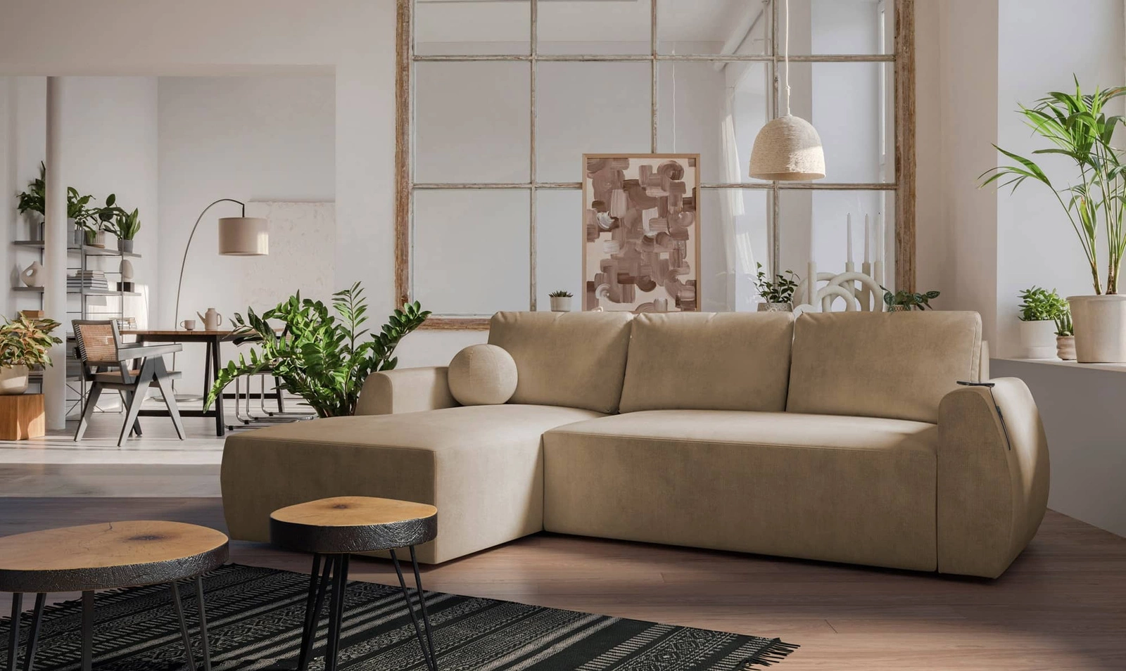 Rohová jednotka s funkcí spánku Colio kombinuje funkčnost s mimořádně elegantní formou. Původnístruktura rohu byla pokryta velurovou tkaninou Vlna 4. Rohová jednotka se vyznačuje neobvyklým designem zdůrazněným zaobleným tvarem, výjimečně měkký a pohodlný sedák a vysoká kvalita zpracování. Hladký povrch celé konstrukce umožňuježe kompozice rohu je ucelená, uzavřená v minimalistickém tónu. Vkusné opěrné polštáře poskytnou této vysoce moderní rohové pohovce ještě větší pohodlí a komfort. Moderní design rohu je ideální pro každý interiér ve vašem oblíbeném stylu.