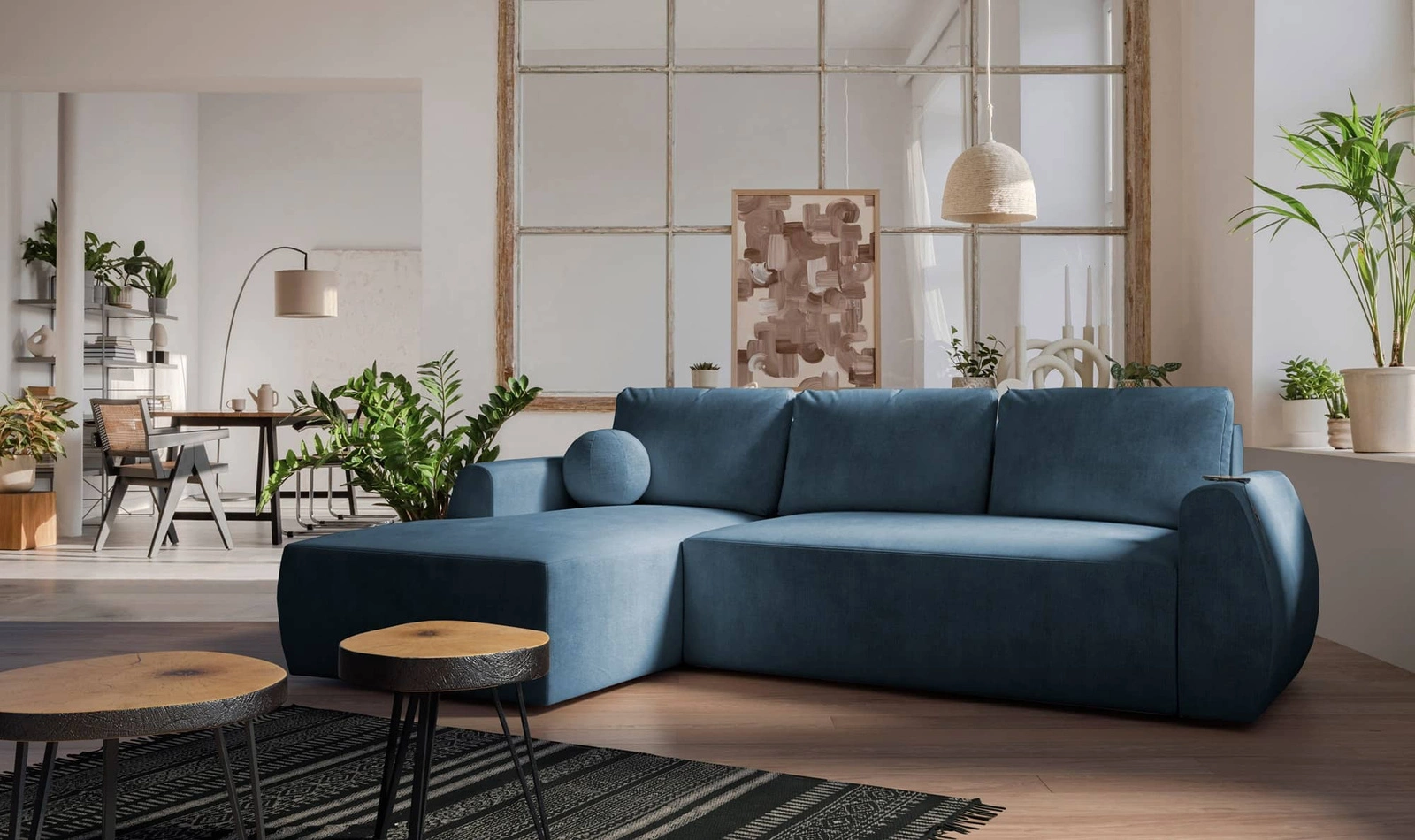 Rohová sedací souprava s funkcí spaní Colio modrá levá strana stylová rohová sedací souprava se zajímavým tvarem velurové tkaniny dekorativní polštářová koule