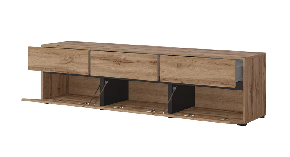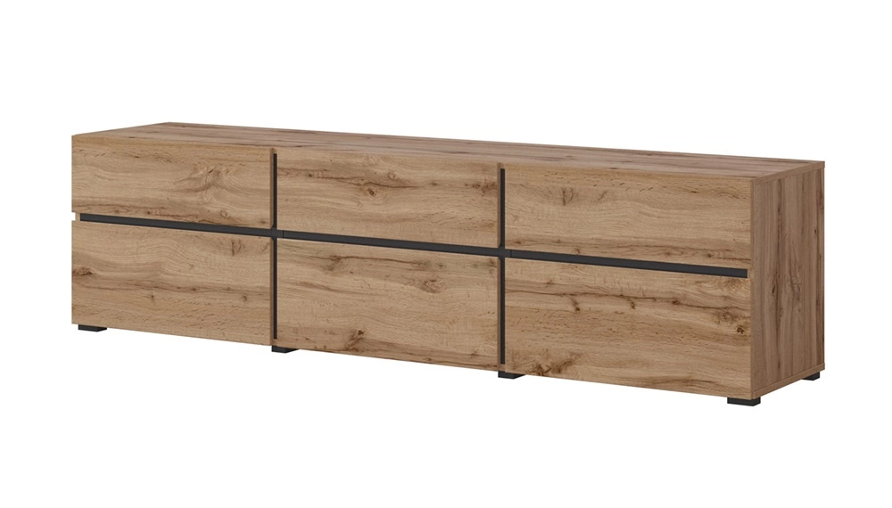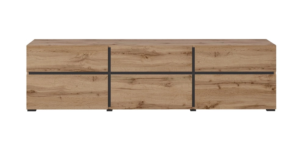 RTV Cross skříň potěší všechny milovníky sofistikovaných aranžmá. Nábytek se vyznačuje jednoduchostí a elegancí a překvapuje širokou funkčností. Původní barvy i geometrické tvar vytvoří jedinečnou atmosféru v každém interiéru. Teplý odstín dubu wotan perfektně sladěno s vložkami v černá dodává nábytku moderní vzhled a kontrast. Tato barevná kombinace dokonale odráží jedinečný charakter televizní skříňky. Netradiční povrchová úprava čel skříněk RTV je decentně frézované rukojeti.