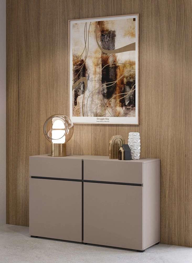 Komoda Cross 119 cm v tmavě béžové barvě je dokonalým kusem nábytku pro milovníky minimalistických interiérů.