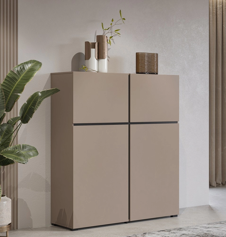 119 cm vysoká komoda Cross v tmavě béžové barvě je ideální volbou nábytku pro milovníky minimalistických interiérů.