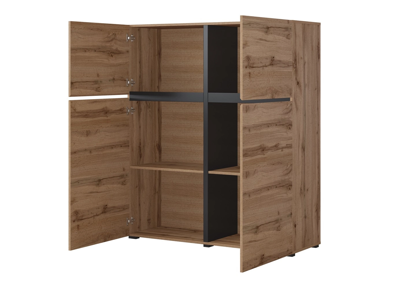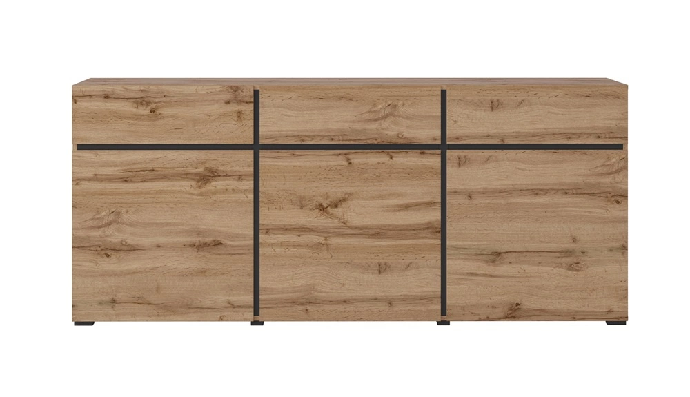 Sada nábytku Cross potěší všechny milovníky sofistikovaných aranžmá. Nábytek se vyznačuje jednoduchostí a elegancí a překvapuje širokou funkčností. Původní barvy i geometrické tvary vytvořit jedinečnou atmosféru v každém interiéru. Teplý odstín dubu wotan perfektně sladěno s vložkami v černá dodává nábytku moderní vzhled a kontrast. Tato barevná kombinace dokonale odráží jedinečný charakter nástěnné skříňky. Neobvyklé ozdobné prvky na čelech nábytku do obývacího pokoje jsou decentní frézované rukojeti.