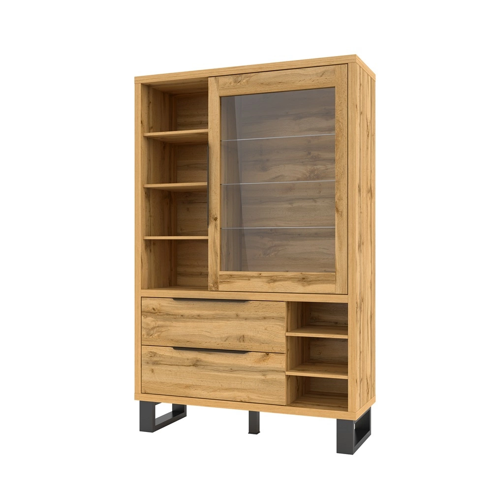 • Vitrína Halle má jednoduchý a elegantní design, který se hodí k současným trendům v interiéru. Dubová barva v kombinaci s kovovým podstavcem podtrhuje moderní styl. Černé hrany rukojetí upoutají pozornost.