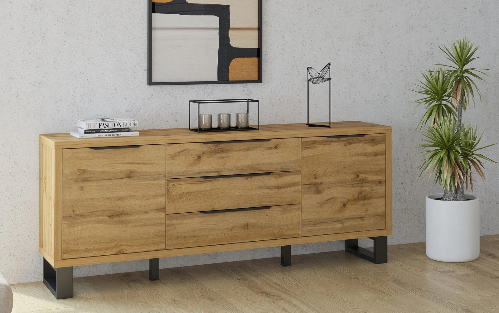 Zásuvková komoda Halle 201 cm dub wotan funkční ideální pro interiéry v industriálním a loftovém stylu stabilní kovová základna