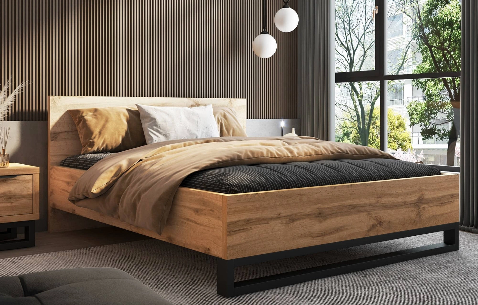 Postel z kolekce Halle S je určena pro moderní a trendy interiéry. Jednoduché tělo ve stínu dub wotan umístěné na černá rámy z odolného materiálu mDF zaručuje vysoká stabilita a designérský, půdní charakter. Díky vysoký základ lůžko získává další funkci. Na posteli můžete pohodlně sedět, např. při sledování televize, práci na notebooku nebo čtení knihy.