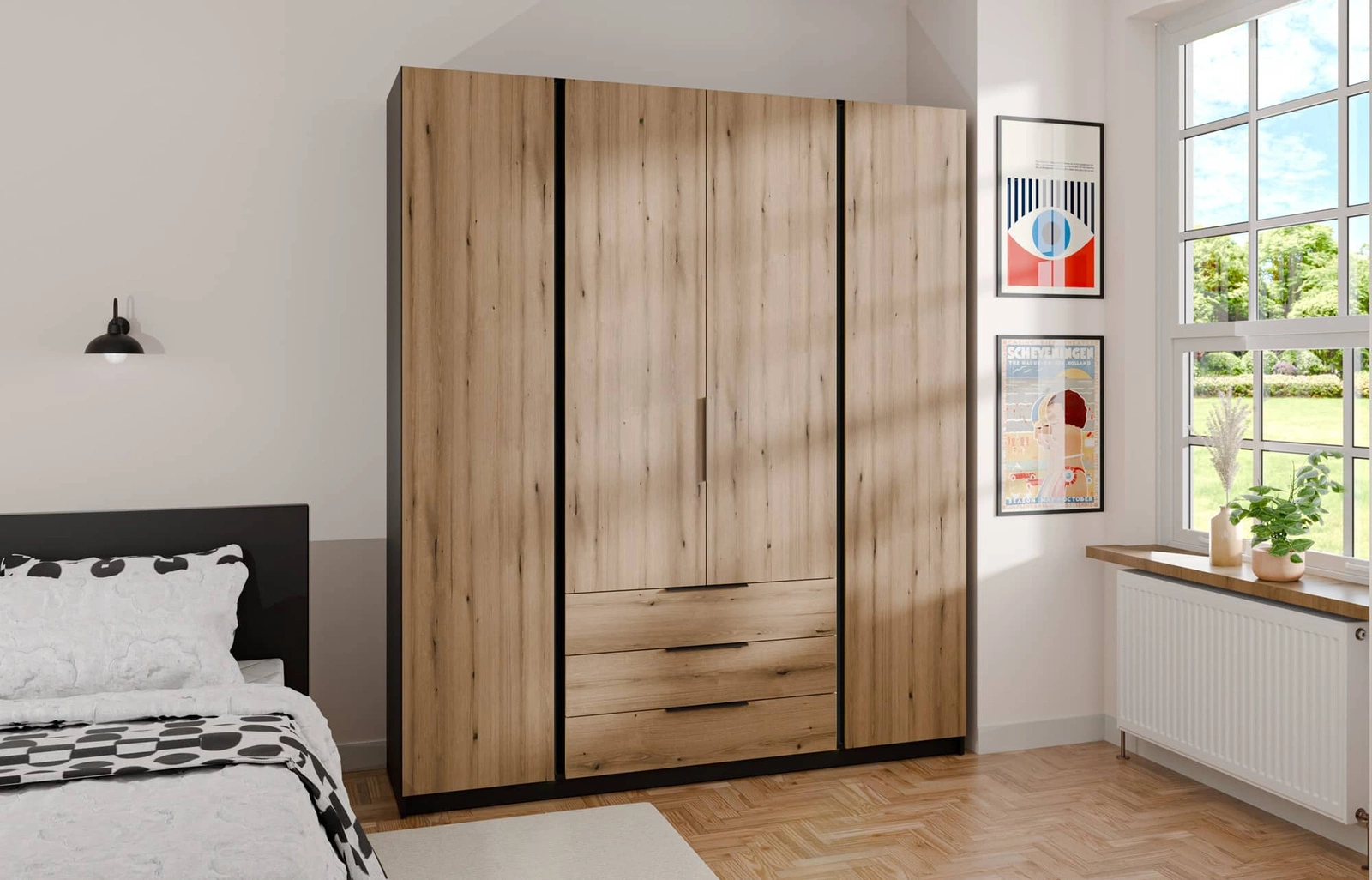 Skříň Kastano je rozdělena na díl s tyčí pro zavěšení oděvů i díl s policemi. Prostorné zásuvky poskytnout další úložný prostor. Wralizací skříně s vysoce kvalitní laminovaná deska tloušťka 16 mm zajišťuje odolnost a stabilitu skříně, což zaručuje dlouhodobou spokojenost s používáním.