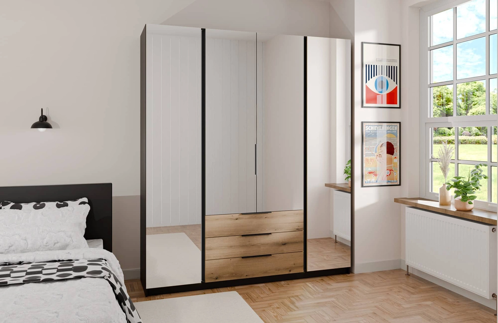 Zrcadlová šatní skříň Kastano VI 200 cm černá / dub evokuje klasický tvar hrany úchytek ideální šatní skříň do ložnice prostorné zásuvky