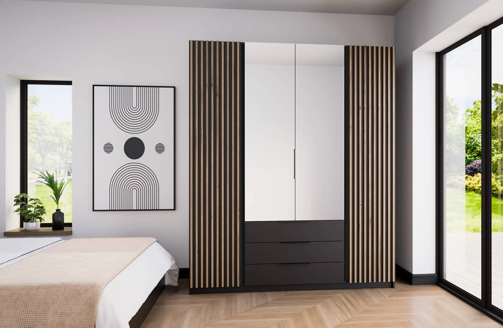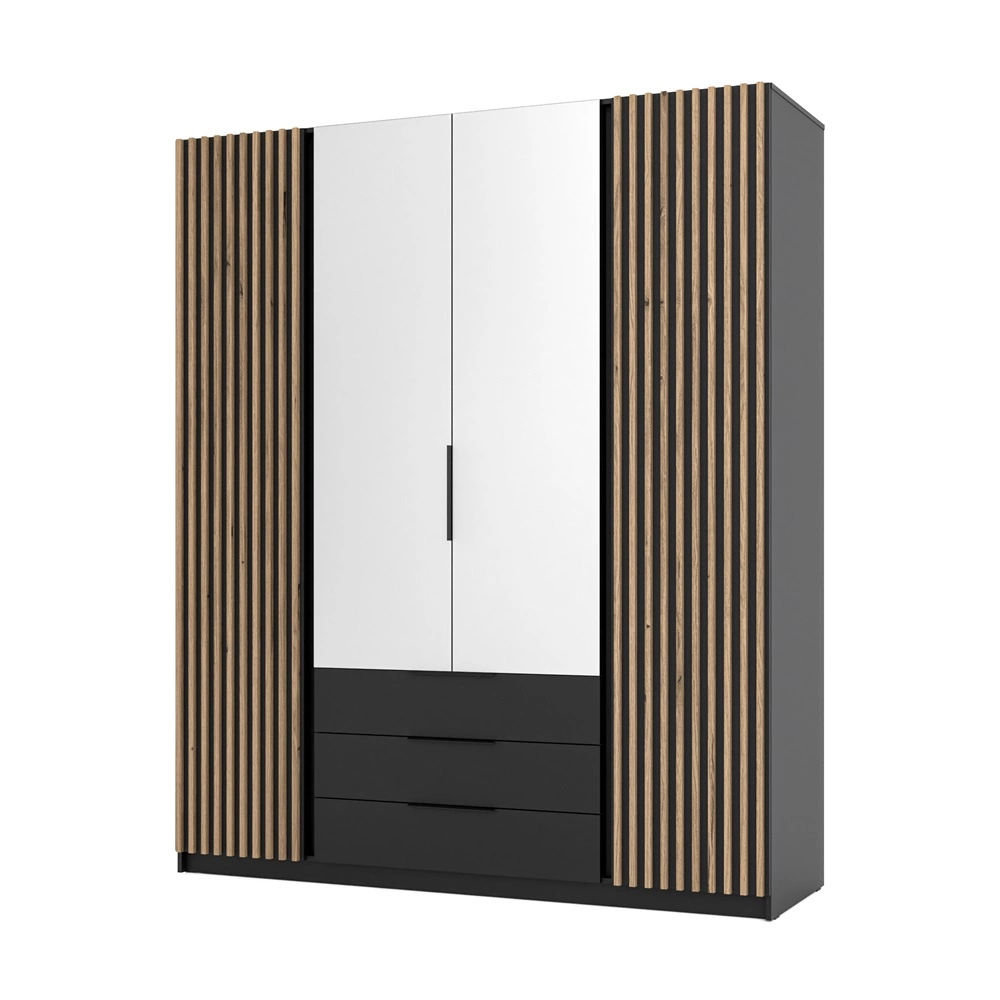Zrcadlová šatní skříň Kastano V 200 cm černá stylová šatní skříň do předsíně Dveře šatní skříně zdobené dubovými lamelami evoke