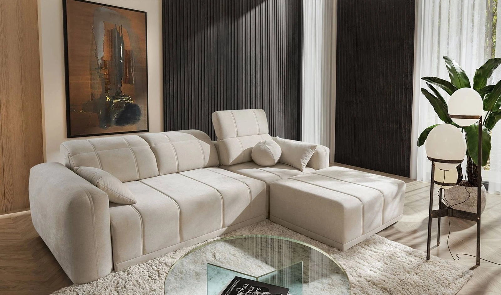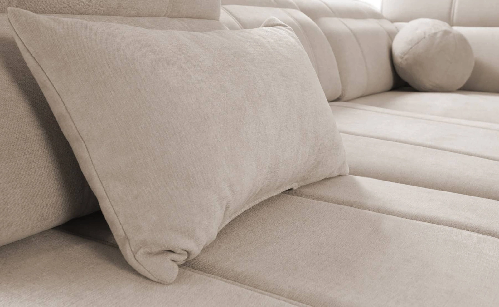 Rohová pohovka Cetara v béžové barvě je mimořádně funkční kus nábytku se stylovou povrchovou úpravou.