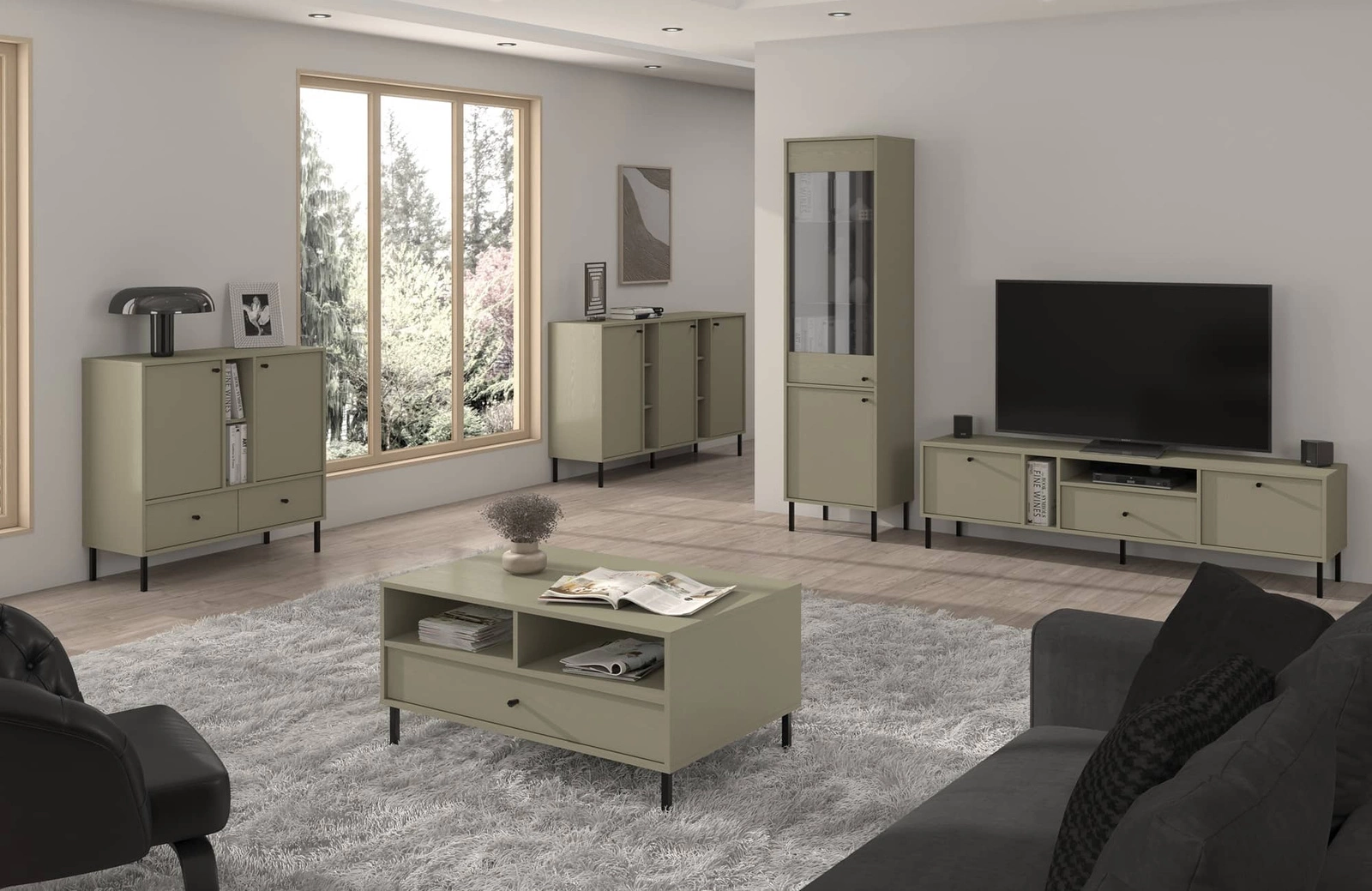 Komoda byla vyrobena z vysoce kvalitní laminovaná deska tloušťka 16 mm, který je odolný vůči vnějším vlivům, jako jsou otlaky, nárazy a nešťastné škrábance. Praktické, otevřené police umožňují vystavit dekorace do obývacího pokoje. Kovové nohy w černá dodávají vizuální lehkost při zachování funkčnosti.