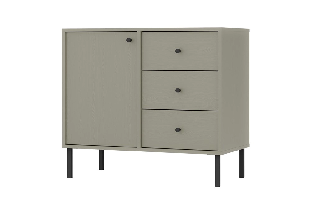 Zásuvková komoda Kioto II 84 cm eukalyptus moderní design decentní černé úchyty kovová základna ideální komoda do obývacího pokoje
