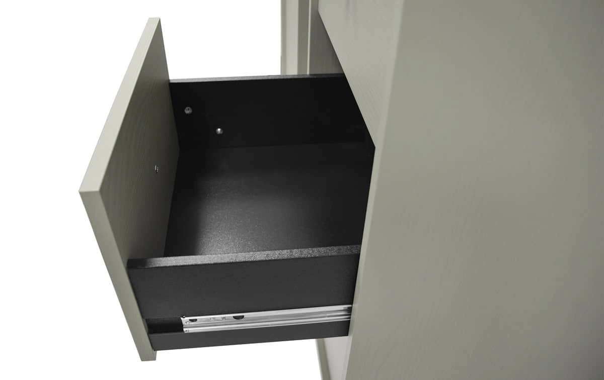 Komoda byla vyrobena z vysoce kvalitní laminovaná deska tloušťka 16 mm, který je odolný vůči vnějším vlivům, jako jsou otlaky, nárazy a nešťastné škrábance. Prostorné zásuvky pojme veškeré potřebné příslušenství a doplňky. Kovový rám w černá barva dodává originalitu při zachování funkčnosti.