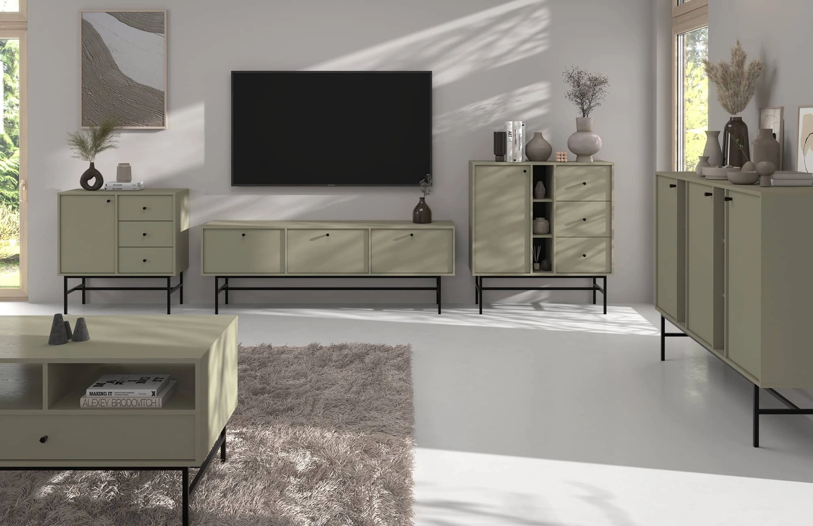 Komoda Kioto je nádherný kus nábytku se zvláštním a jedinečným charakterem. Neobvyklá kombinace zelená v eukalyptovém odstínu s černými úchyty celý vzhled je decentní a velmi stylový. Staženo ve vztahu k jatečně upravenému tělu, přední části kromě toho, že vytvářejí výraznou dekoraci, dodávají jemnost a eleganci. Komody ze sbírky Kjóto je jedinečný projekt, který svou formou a designem dokonale zapadá do prostředí opatření v japonské a moderní styly.