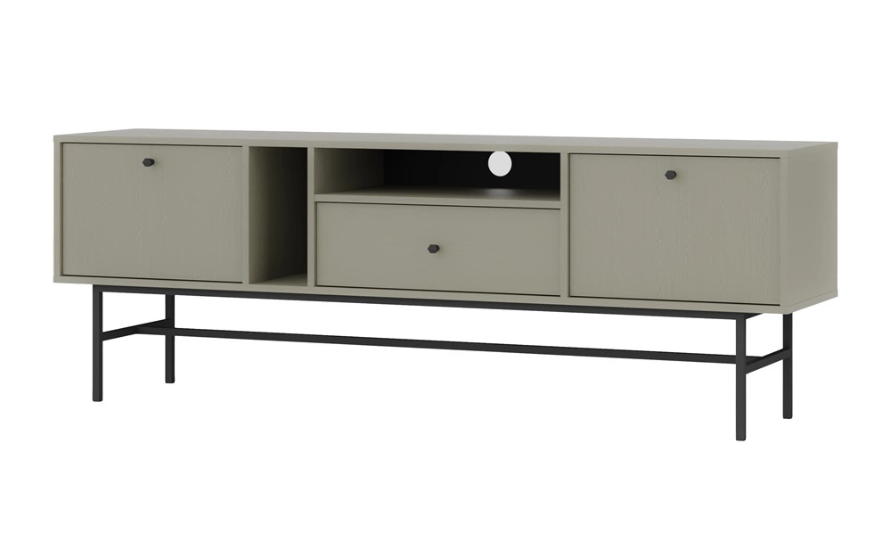 Prosklená přední část vitríny je vyrobena z tvrzené bezpečnostní sklo v tmavém odstínu. Vnitřek skříně je částečně vybaven skleněnými policemi z odolného tvrzeného skla. Skříň RTV je vyrobena z 3 dveří otevíraných směrem dolů. Nábytek je vybaven výsuvnými zásuvkami na s kuličkovými ložisky. Pastelové barvy se dokonale hodí pro sofistikovaná aranžmá, díky čemuž nábytek do obývacího pokoje Kjóto je ideální pro jako nástěnná skříňka do obývacího pokoje v minimalistickém provedení povrchová úprava nebo obývací stěna v klasickém stylu.