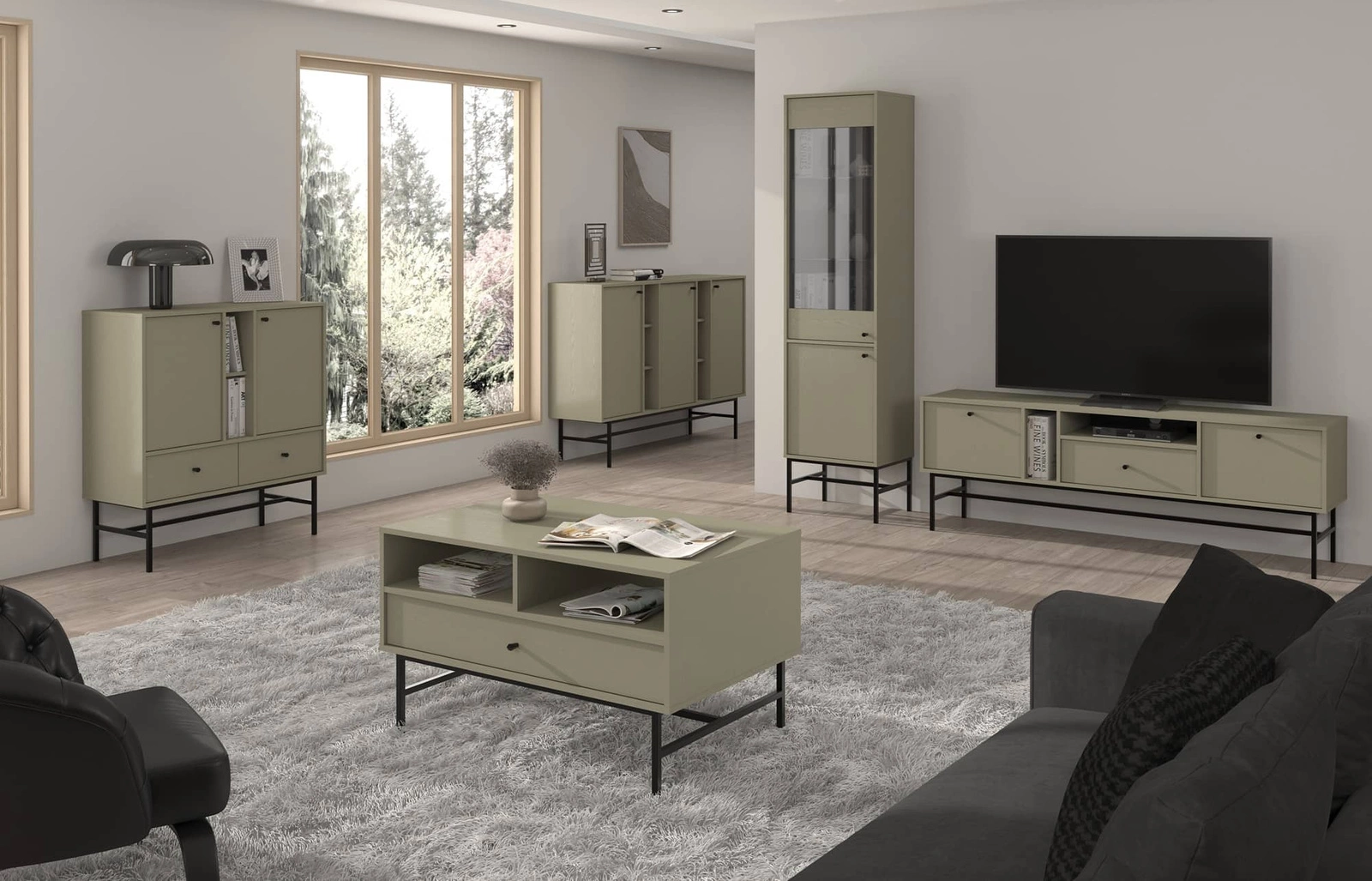 Sada nábytku Kyoto jsou nádherné kusy nábytku se zvláštním a jedinečným charakterem. Neobvyklá kombinace eukalyptově zelené s černými rukojeťmi nástěnná skříňka vypadá decentně a velmi stylově. Staženo ve vztahu k jatečně upravenému tělu, přední části kromě toho, že vytvářejí výraznou dekoraci, dodávají jemnost a eleganci. Nábytek do obývacího pokoje z kolekce Kyoto je jedinečným projektem, který svou formou a designem dokonale zapadá do interiéru opatření v japonské a moderní styly.