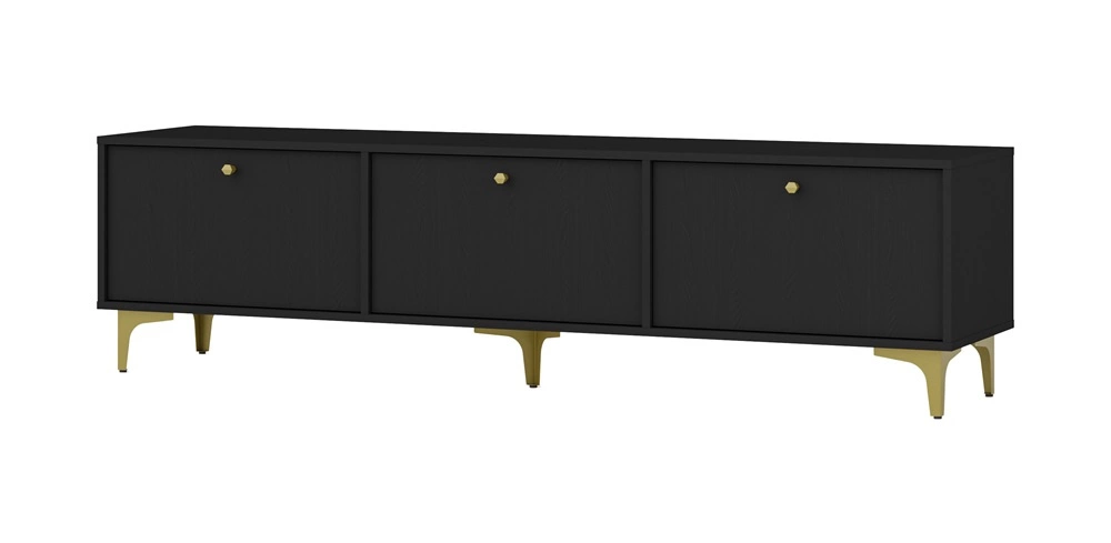 Televizní skříňka Kyoto je nádherný kus nábytku se zvláštním a jedinečným charakterem. Neobvyklá kombinace tmavý odstín grafitu se zlatými rukojeťmi celý vzhled je decentní a velmi stylový. Staženo ve vztahu k jatečně upravenému tělu, přední části kromě toho, že vytvářejí výraznou dekoraci, dodávají jemnost a eleganci. Televizní skříňka z kolekce Kioto je jedinečný design, který svým tvarem a provedením dokonale zapadá do interiéru opatření v japonské a moderní styly.