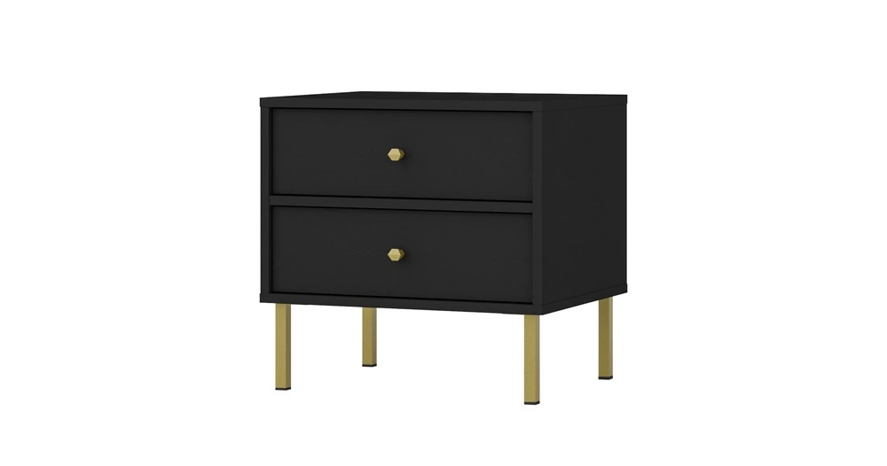 Noční stolek Kioto II černý grafit se zásuvkami ideální skříňka do ložnice na kovovém zlatém podstavci s jemnými úchyty