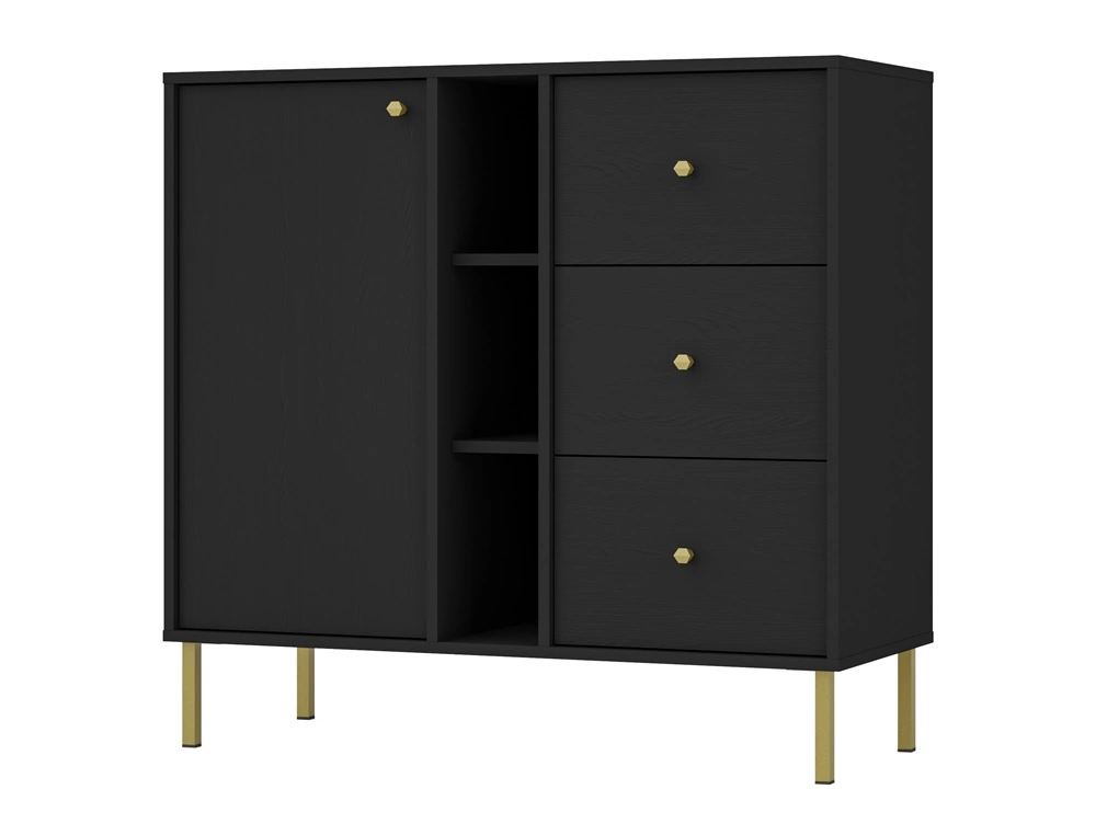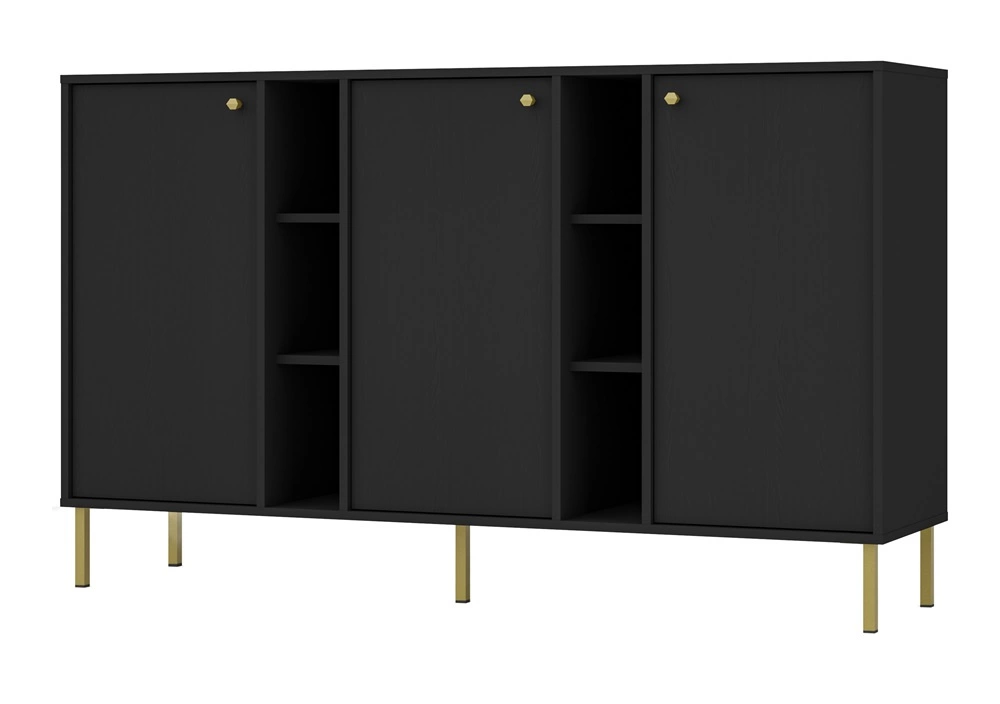 Nástěnná skříňka Kioto je vyrobena z vysoce kvalitní laminované desky tloušťka 16 mm, která je odolná vůči vnějším vlivům, jako jsou otlaky, nárazy a nešťastné škrábance. Otevřené police komoda umožňuje vystavit doplňky, které zdobí váš obývací pokoj. Kovové nohy w zlatý barva dodávají vizuální lehkost při zachování funkčnosti.