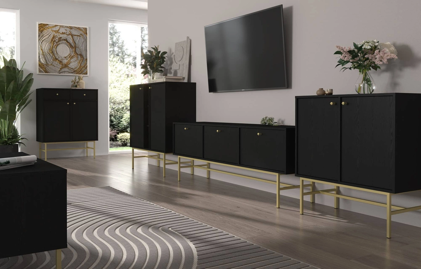 Komoda Kioto III 84 cm černá grafitová minimalistický design dokonalý návrh komody do ložnice nebo obývacího pokoje zlaté úchyty