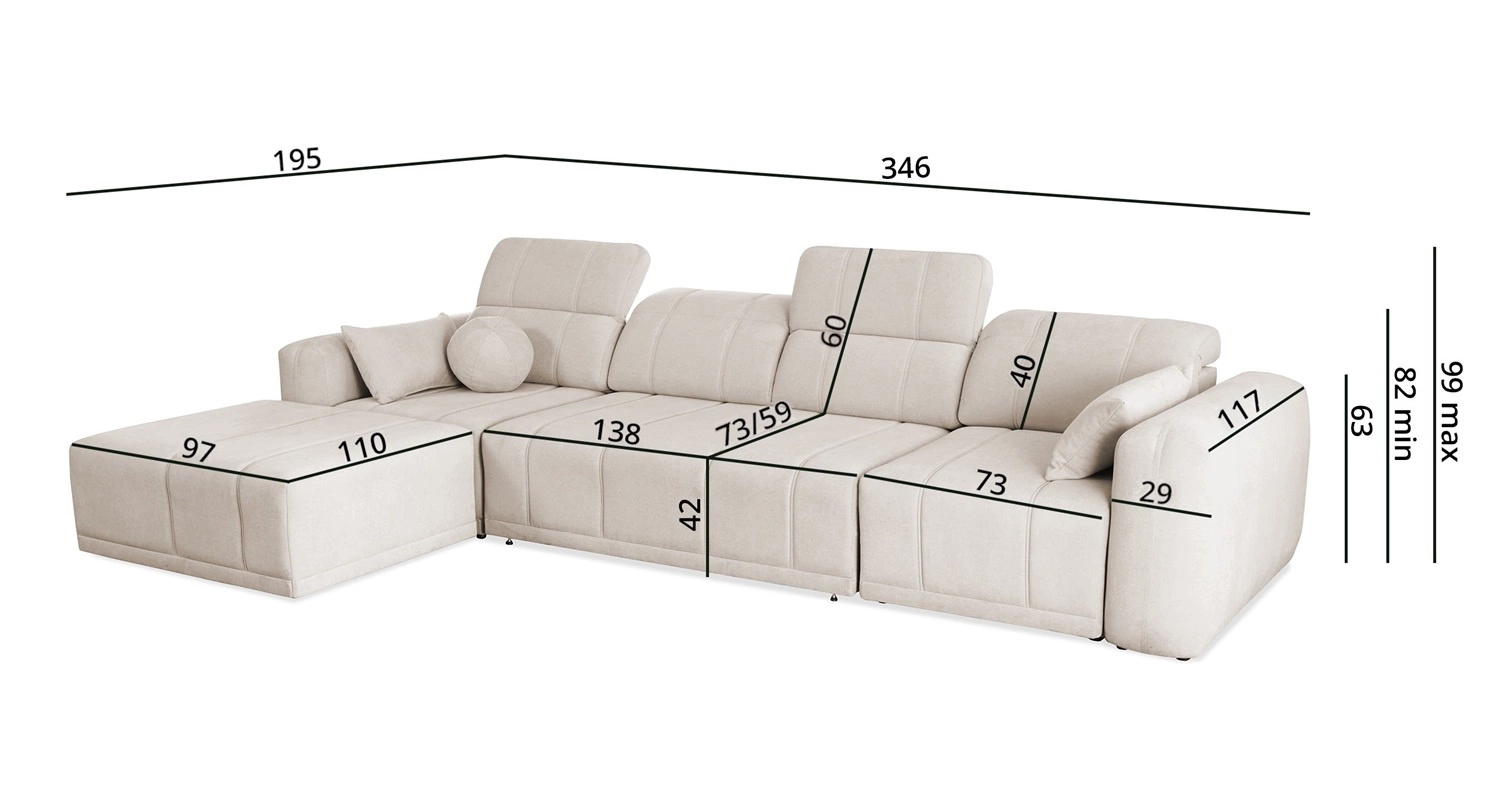 Rozměry nábytku umožňují vyplnění prostoru v prostorném obývacím pokoji nebo zasedací místnosti. Šířka rohu 346 cm, maximální výška 99 cm a hloubka 195 cm. Spací plocha rohové jednotky je 138x213 cm. Výška sedadla nábytku je 42 cm a maximální výška opěradla je 60 cm. Vlnité pružiny a polyuretanová pěna T30 je materiál, z něhož je vyrobeno sedadlo rohu. Zádová opěrka s nastavitelnými opěrkami hlavy vám umožní snadno nastavit úhel opěrek hlavy podle vašich preferencí a zaručí pohodlný odpočinek po dlouhém dni, který oceníte vy, vaši blízcí i hosté, kteří si na tuto jedinečnou rohovou sedačku sednou.