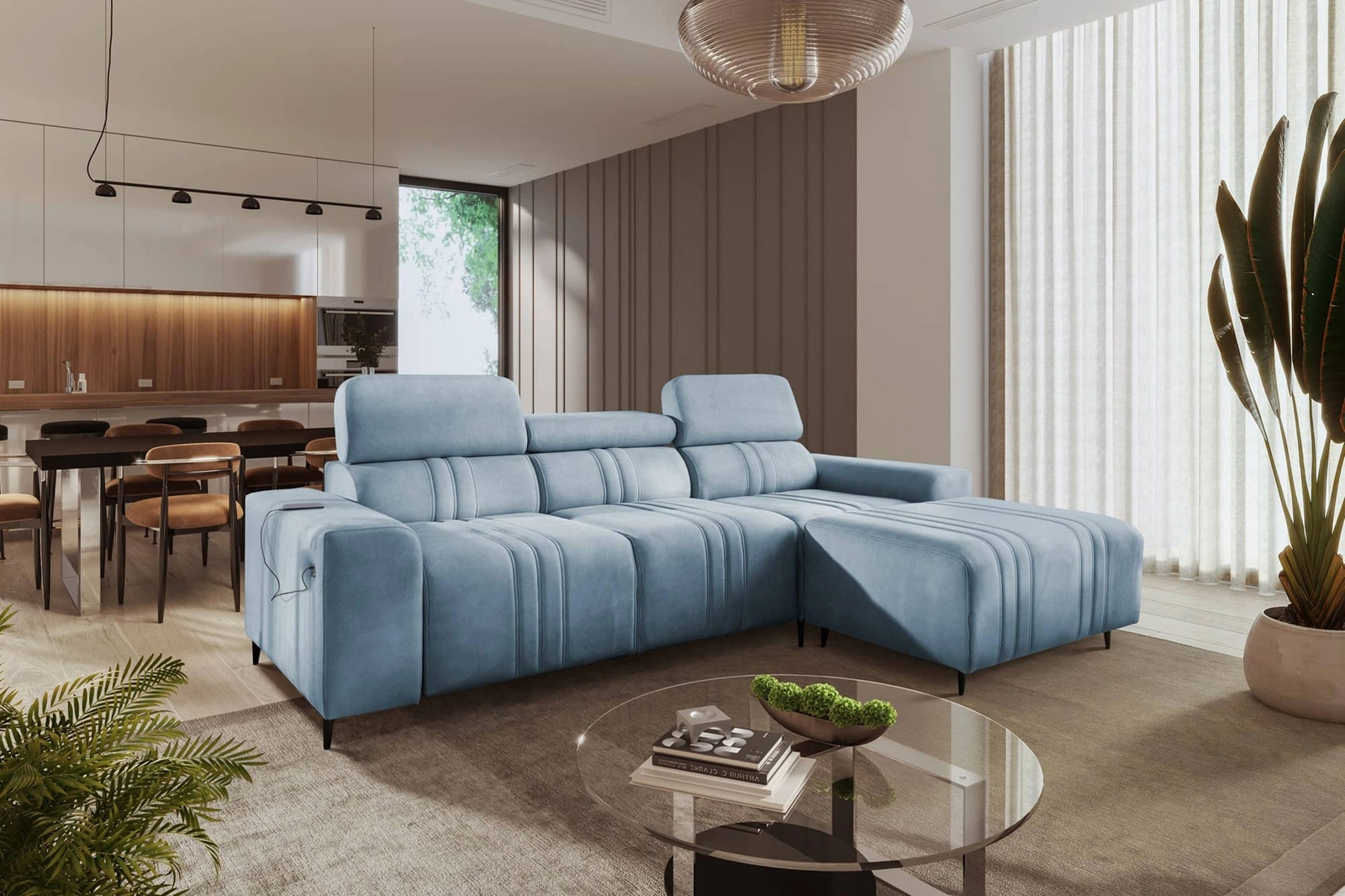 Rohová pohovka Castel v modré barvě s nastavitelnými opěrkami hlavy je mimořádně elegantní kus nábytku se zajímavou povrchovou úpravou.