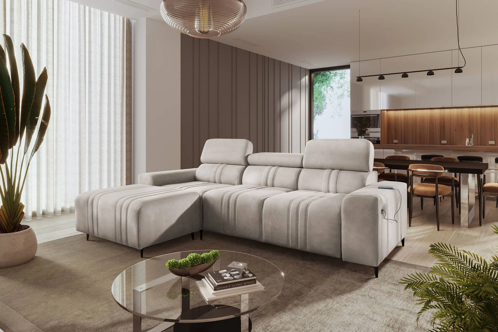 Mezi doplňky tohoto nábytku, které ocení všichni uživatelé, patří kontejner na lůžkoviny, nastavitelné opěrky hlavy a nabíjecí zásuvka USB v boční části rohové skříně.