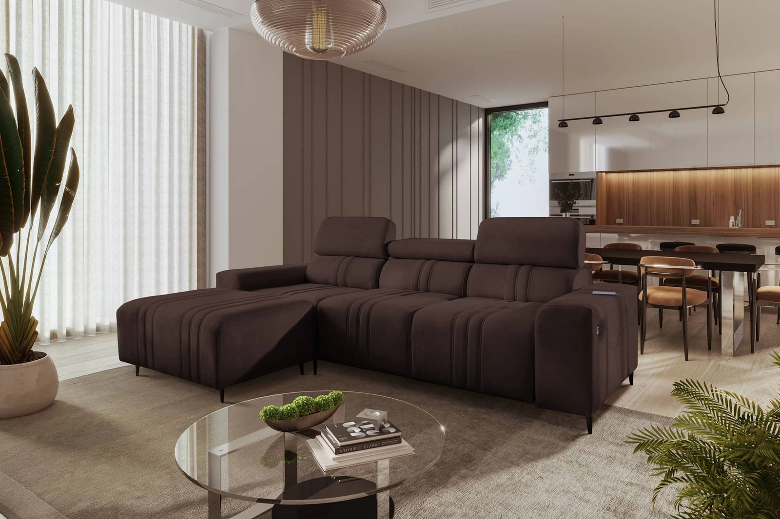 Rohová pohovka Castel v hnědé barvě s nastavitelnými opěrkami hlavy je mimořádně elegantní kus nábytku se zajímavou povrchovou úpravou.
