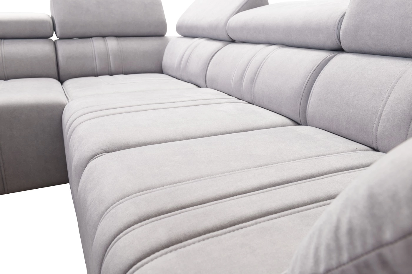 Rohová pohovka Castel II v šedohnědé barvě s nastavitelnými opěrkami hlavy je mimořádně elegantní kus nábytku se zajímavou povrchovou úpravou.