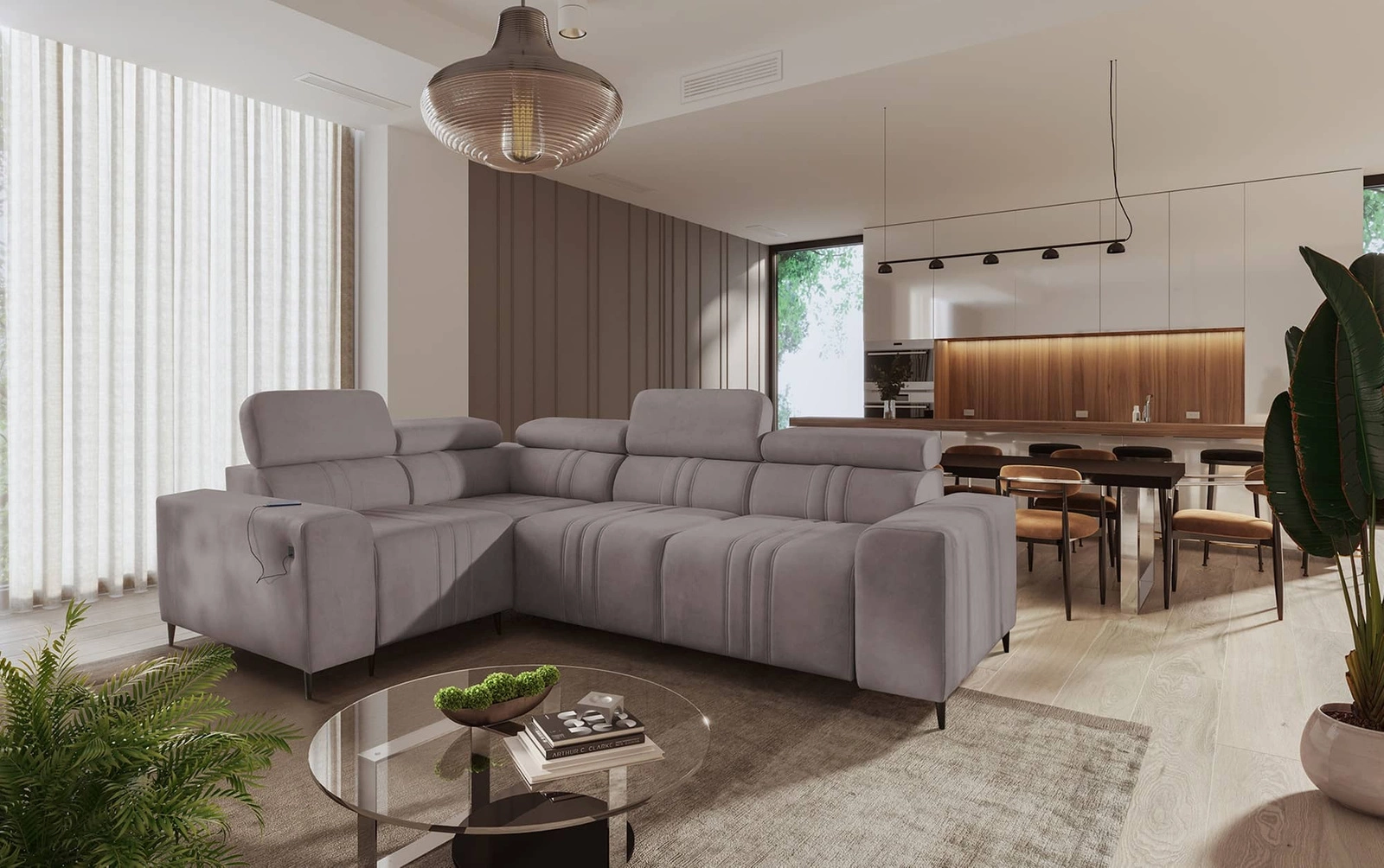 Mezi doplňky tohoto nábytku, které ocení všichni uživatelé, patří kontejner na lůžkoviny, nastavitelné opěrky hlavy a nabíjecí zásuvka USB v boční části rohové skříně.