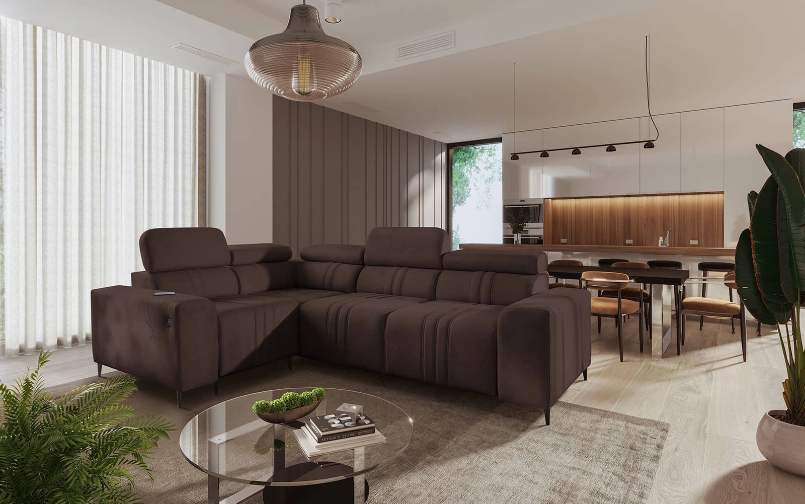 Rohová pohovka Castel II v hnědé barvě s nastavitelnými opěrkami hlavy je mimořádně elegantní kus nábytku se zajímavou povrchovou úpravou.